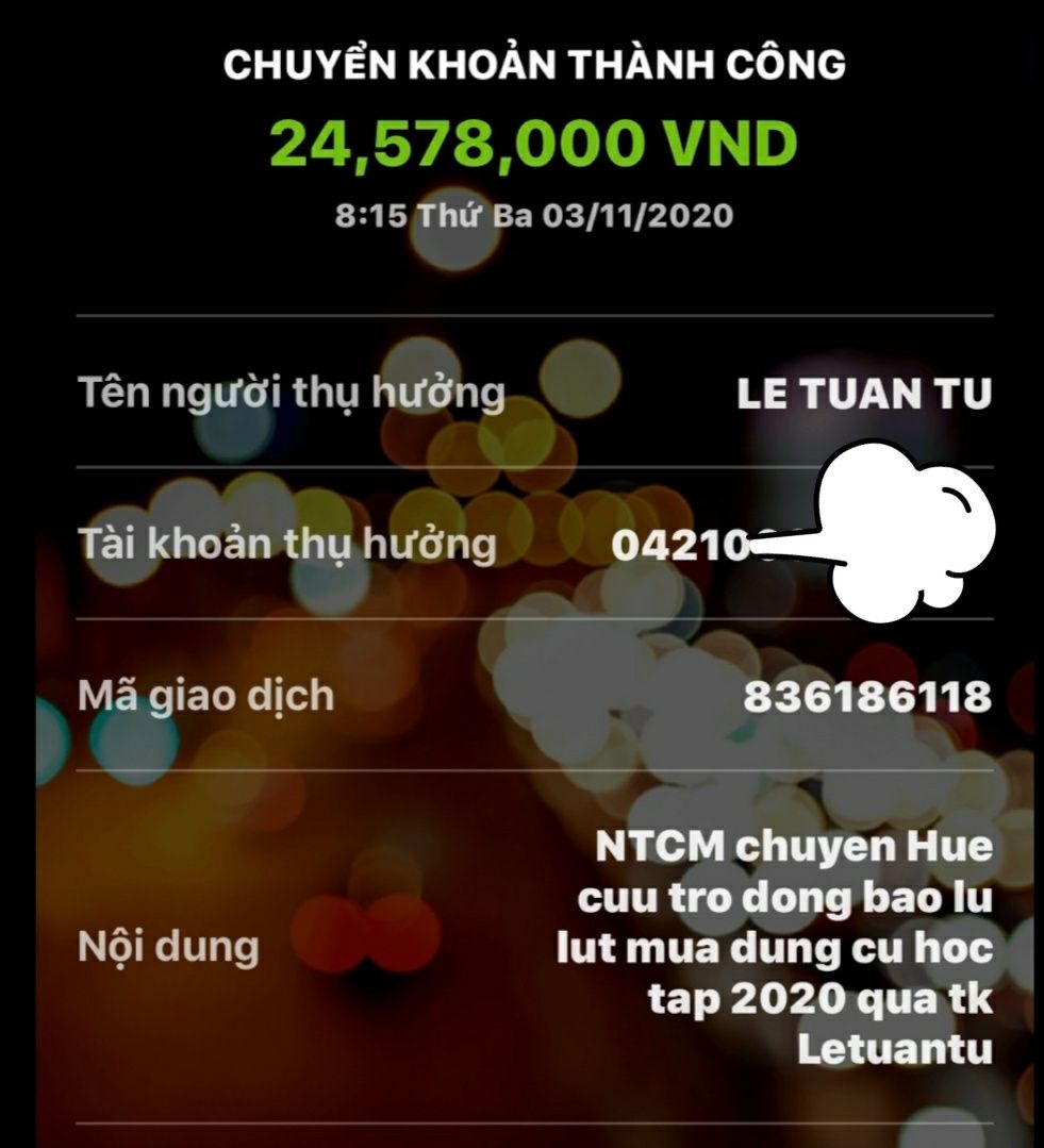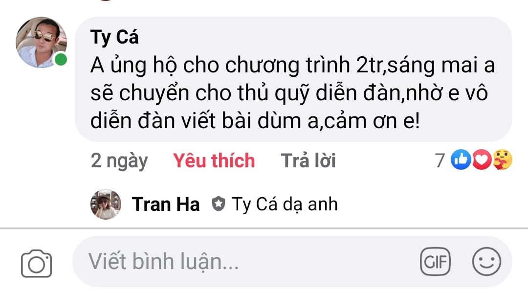 Anh Minh Ty ủng hộ cho chương trình 1,000,000đ. Letuantu đã nhận và chuyển tiền vào tài khoản thủ quỹ.