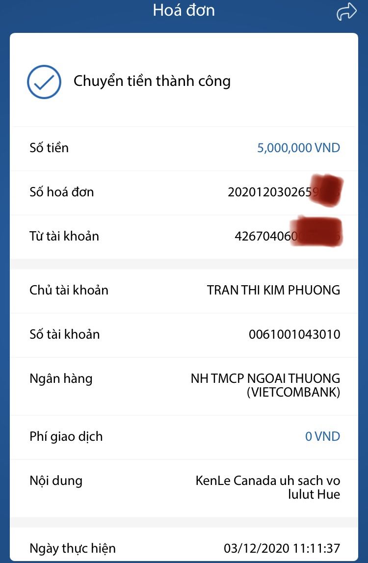 Anh Khanh Canada (Ken Le) góp 5.000.000đ để các bạn mua giúp dụng cụ học tập cho các em vùng lũ đợt này. (Đã chuyển quỹ NTCM).