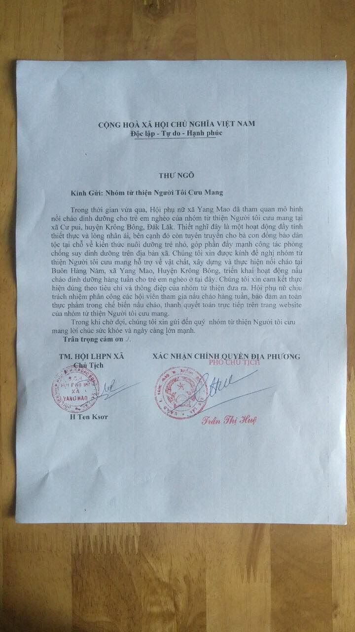 Như đã bàn từ bài viết trước, Phụng- cưpui nhận nhiệm vụ đi xác minh nồi cháo Buôn Hàng năm xã yang mao- huyện kRông bông- Đăk lăk, nhưng vì lý do thời tiết nên  phụng không đi xác minh trực tiếp được, và đã trao đổi qua điện thoại với chị chủ tịch phụ nữ xã, và đã nhận được thư ngõ của chính quyền địa phương gửi Người Tôi Cưu Mang.