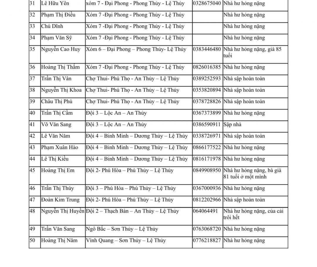 Chào cả nhà . Danh sách 50 hộ gia đình trên địa bản huyện Lệ Thủy bị ảnh hưởng nặng nề sau lũ lụt. Rất mong sự chung tay ủng hộ của cả nhà. Trân trọng