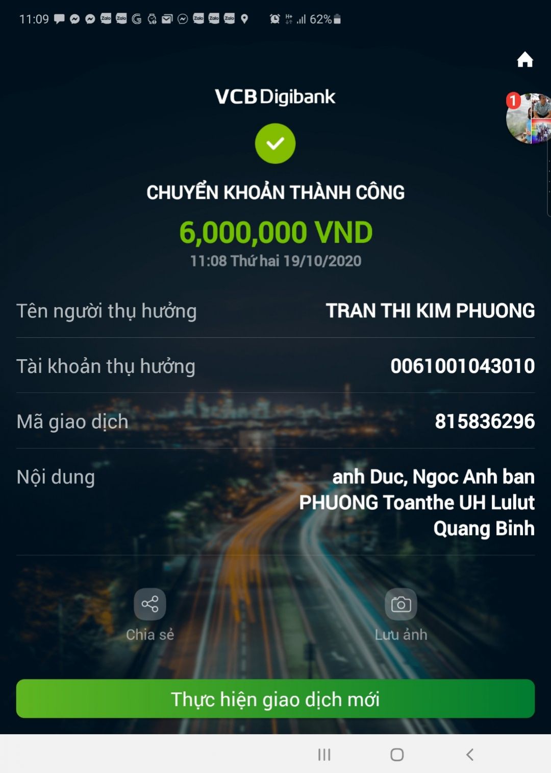 Anh Đức, Ngọc Anh bạn của anh Phương Toàn Thế ủng hộ Quảng Bình 6tr VND. Đã chuyển khoản. Cảm ơn tấm lòng của các anh các chị hướng về Quảng Bình yêu thương!