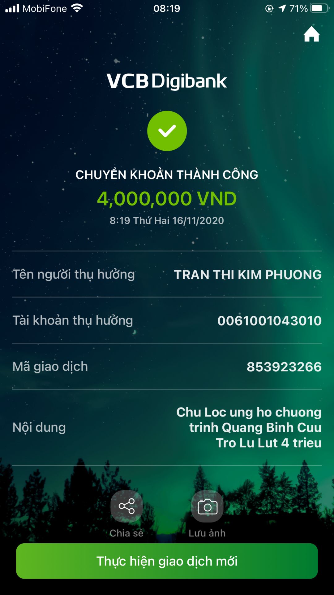 * Hiện kim, tiền xin gữi về thủ quỷ diển đàn . Trần thị Kim Phượng . STK: 0061001043010 ngân hàng Vietcombank Nha Trang