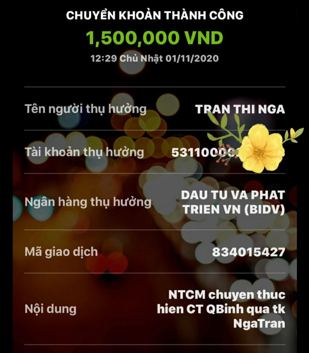 Chị Diễm Trang ủng hộ bà con Quảng Bình 1,000,000đ đã chuyển khoản cho Thủ Quỹ Thocon rồi ạ.