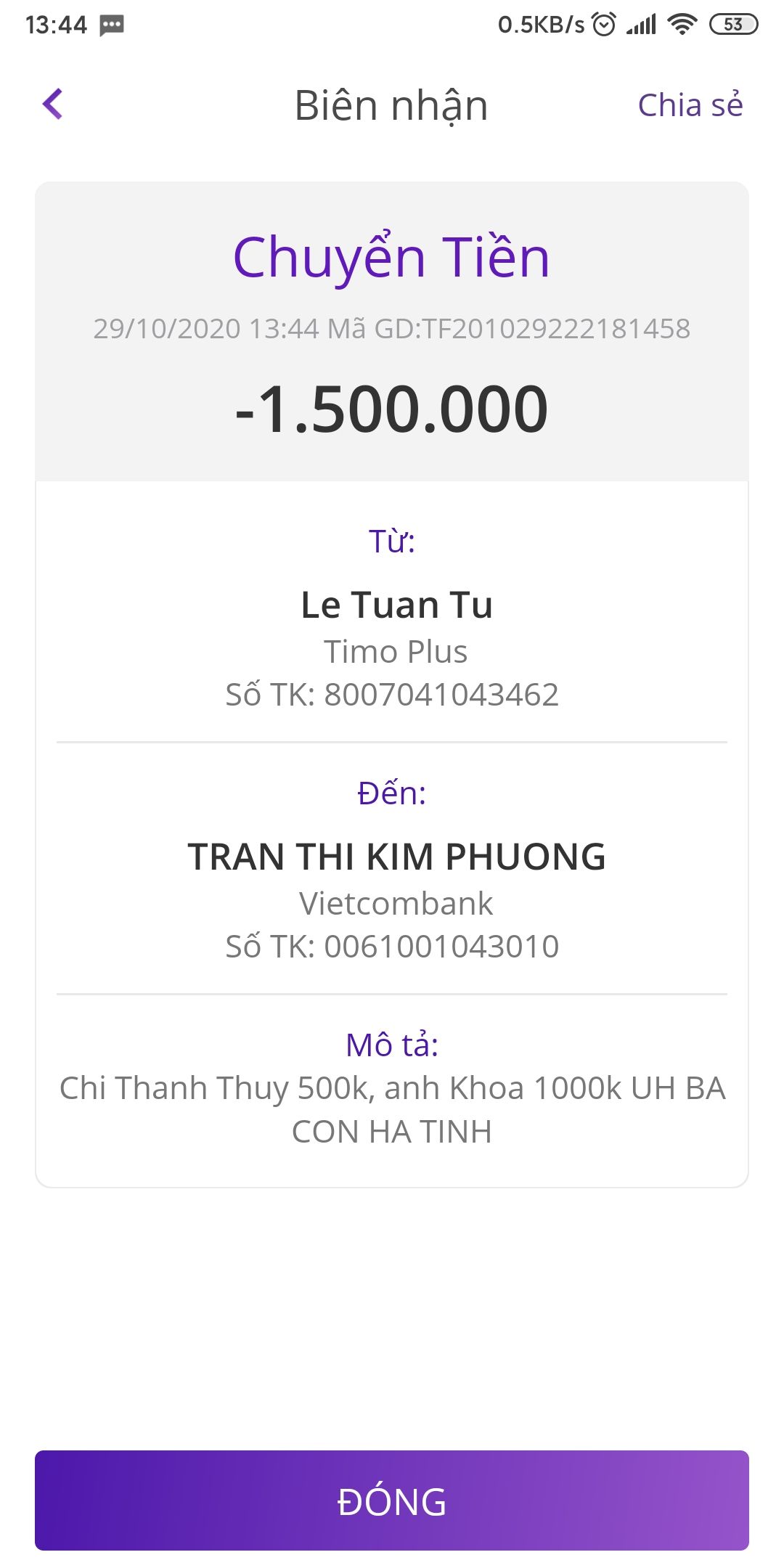 1 người bạn chuyển khoản cho thủ quỉ.