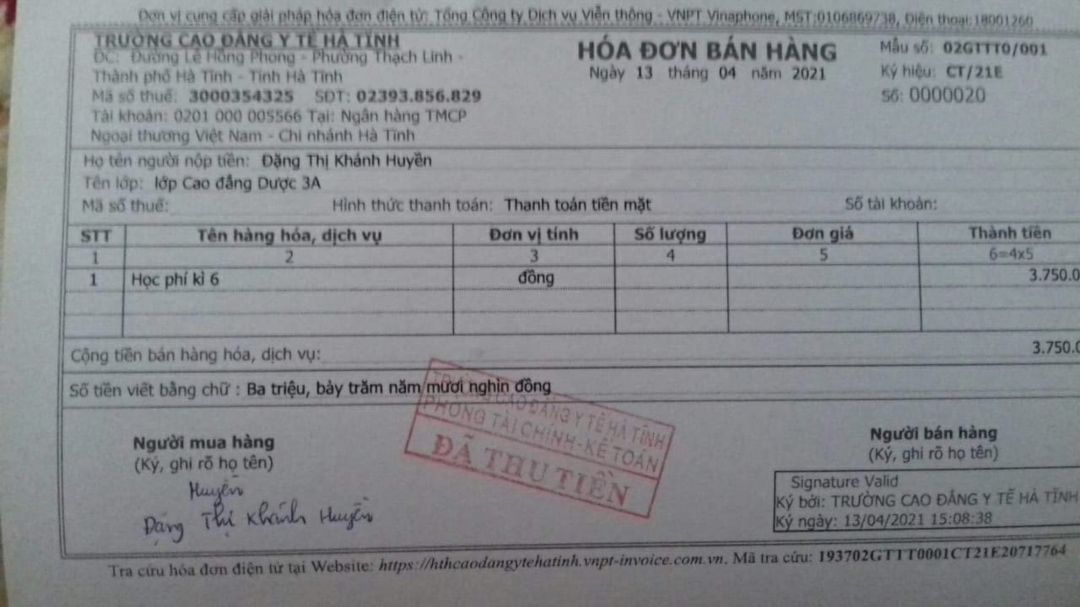 E xin cập nhật hoá đơn tiền học kỳ 6