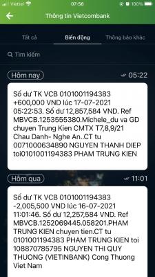 Lathuvang vừa trung chuyển TK Trung Kiên 600,000đ CMTX T7,8,9/21 cháu Danh của Michele_du và GĐ. Nhờ Kiên chuyển tiếp dùm nhé. Cảm ơn nhiều .