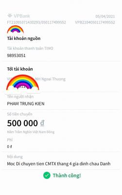 Trích dẫn của: banbe6x vào 02-03-2021 06:05:31Các bạn cập nhật hình ảnh trao tiền CMTX tháng 2/2021 để cả nhà cùng nắm được ạ.Xin cảm ơn sự chung tay của cả nhà.Thân.Chào bác 6x, hình ảnh đã đăng trao cưu mang tháng 2/2021 phía dưới. Bác 6x xem kĩ lại giúp cháu ạ . Cám ơn cả nhà ạ