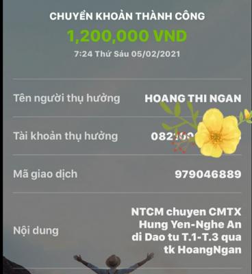 @Thocon : Em xuất quỹ chuyển tới Hoàng Ngân 1,200,000đ tiền CMTX dì Đào trong 3 tháng kể từ tháng 1/2021.