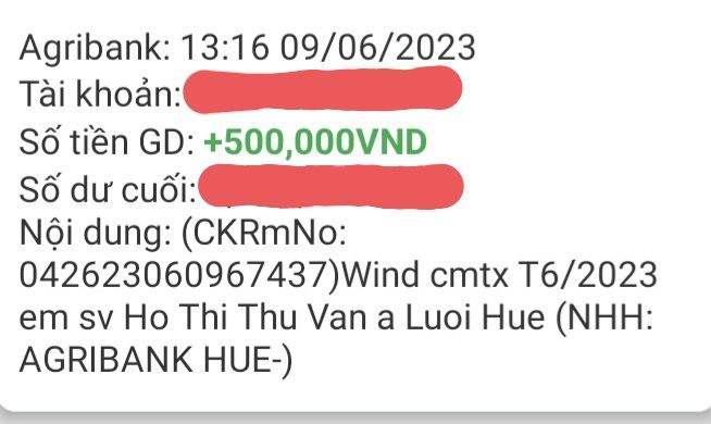 Con là Vân, con đã nhận được số tiền 500.000đ trong tháng 6 từ sự giúp đỡ của cô Wind cmtx ạ. Con và gia đình con cảm ơn tấm lòng của cô Wind cũng như cô Trang và các cô chú mạnh thường quân nhiều ạ.