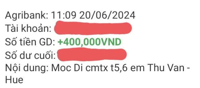 Loannguyen đã chuyển 400,000đ CMTX T5,6 từ Mộc Di đến em Vân rồi nhé.
