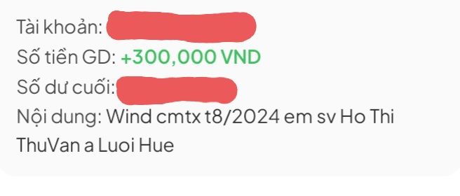 Con đã nhận được số tiền là 300.000đ trong tháng 6 từ sự giúp đỡ của cô Wind rồi ạ. Con cảm ơn cô Wind đã luôn đồng hành và giúp đỡ con trong khoảng thời gian vừa qua ạ.