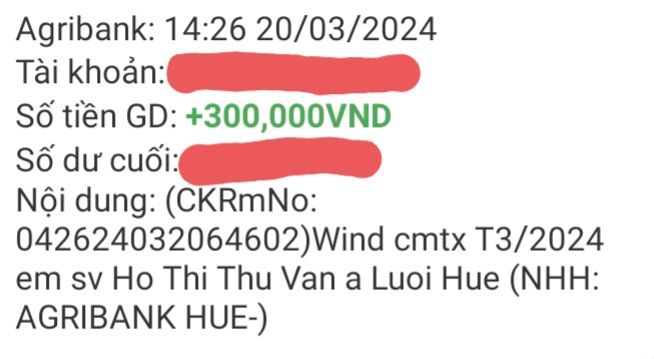 Con là Vân, con đã nhận được số tiền 300.000đ trong tháng 3 từ sự giúp đỡ của cô Wind ạ. Con và gia đình con vô cùng biết ơn cô Wind và các cô chú mạnh thường quân nhiều ạ.