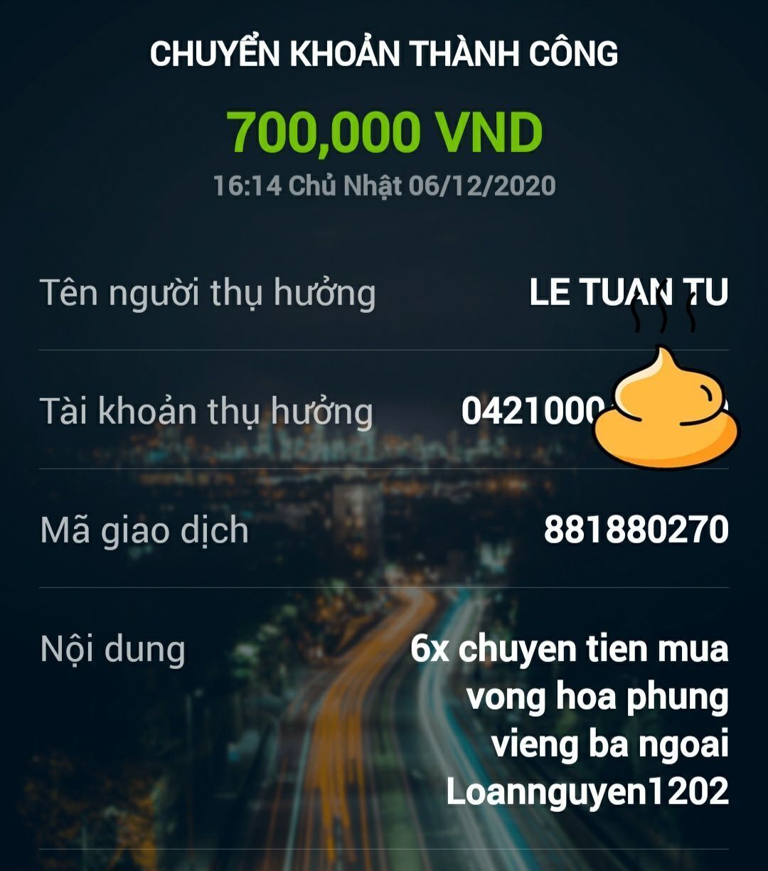 : Em xuất quỹ chuyển tới 6x 500,000đ tiền mua vòng hoa viếng Bà Ngoại Loannguyen1202 dùm nhé.
