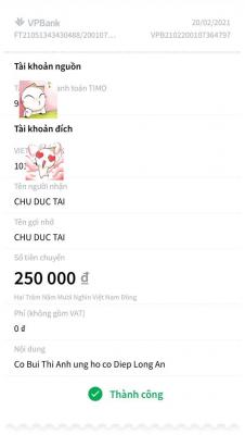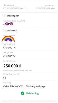 Loanngyen đã chuyển 250,000đ tiền CMTX tháng 4/2021 từ cô Bùi Thị Anh đến @DucTai nhờ Tài chuyển giúp cho cô Điệp nhé. Cảm ơn nhiều ạ !