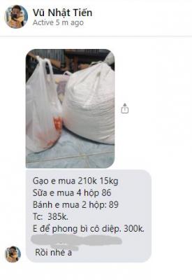 Các bạn đã sử dụng tiền CMTX ( 100k từ bạn Quyen Nguyen và 250k từ gia đình Nhím con để mua nhu yếu phẩm ), Ngoài ra DucTai và bạn Vũ Nhật Tiến cũng gửi thêm cho cô Diệp 335k ( 35k tiền bù mua nhu yếu phẩm và 300k tiền mặt).
