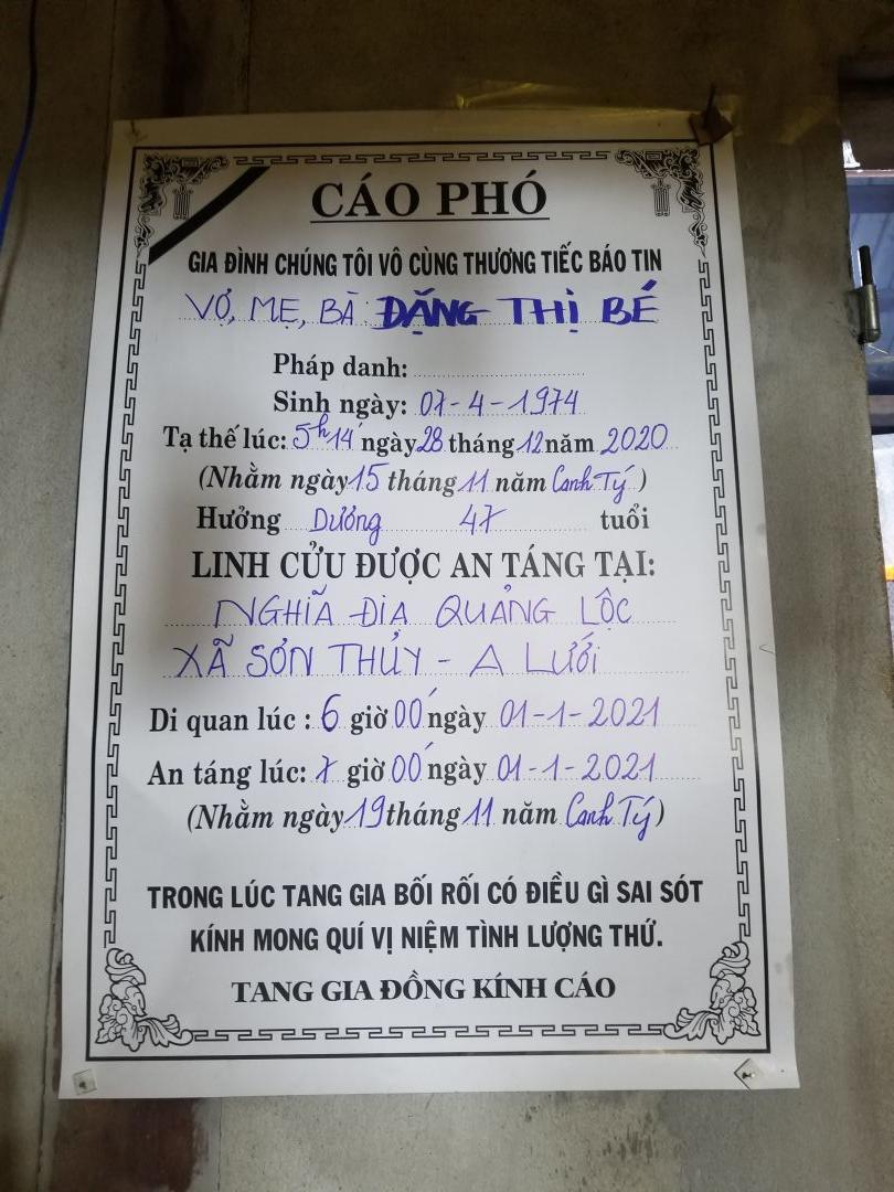 Theo thông tin của TNV nhóm Huế_ NTCM tại A Lưới, T T Huế, thì dì Đặng Thị Thủy _ tên thường gọi là Đặng Thị Bé _ Hoàn cảnh nhóm đang thực hiện CMTX đã mất vào lúc 5h14p ngày 28/12/2020.(15/11 âm lịch )