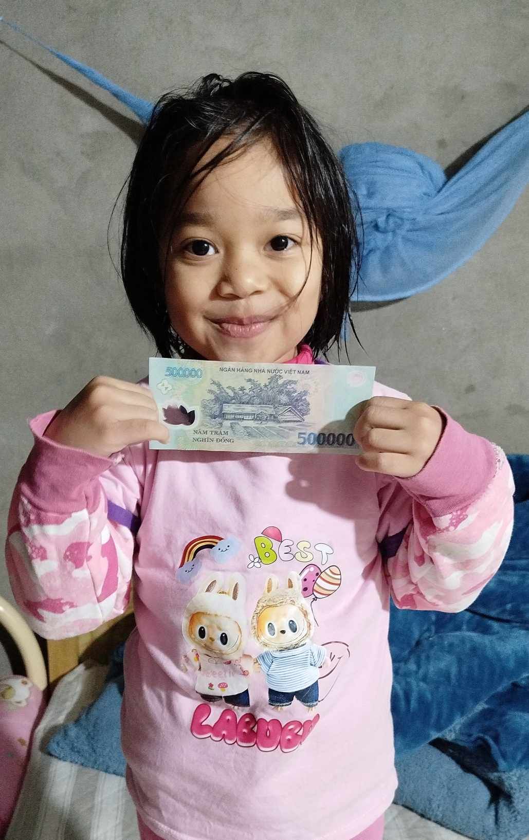Em đã trao 200.000 đ tới cháu Khánh Băng. Theo thông tin từ mẹ cháu, hiện cháu đã đi học mẫu giáo lớn, nhưng phải đem theo nhiều quần nhờ các cô hỗ trợ thay vì đi ngoài lắc nhắc mất kiểm soát. Cháu vẫn phải uống thuốc hàng tháng theo đơn và đa số mua ngoài do điều kiện đi viện xa nên không đi đều được.