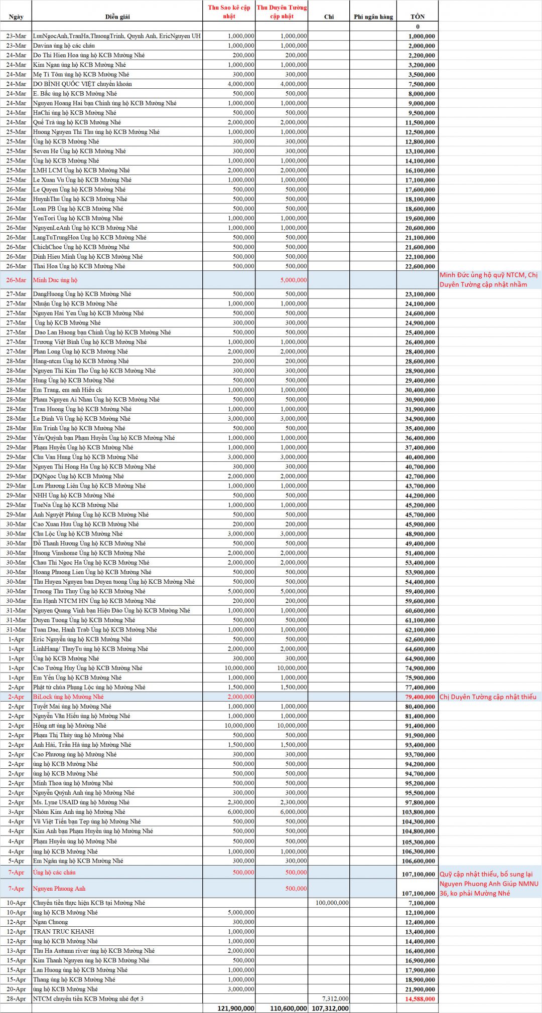 Các khoản thu theo cập nhật của Duyên Tường đến ngày 23/3/2021 là 110.603.000 vnđ. Hiện nay số tiền đã vượt mức đó rồi và được Duyên Tường cập nhật sau