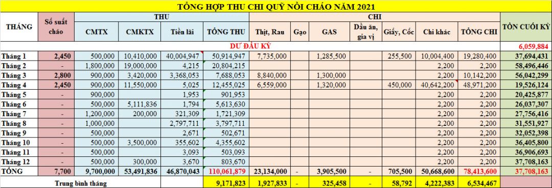 Toàn bộ các chỉ tiêu thu, chi đều tăng so với cùng kỳ năm ngoái, do tăng số buổi nấu cháo từ 4 buổi (năm 2020) lên 22 buổi (năm 2021).