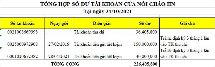 Tổng tồn quỹ cháo tại ngày 30/04/2021 là 209.526.124đ. Cụ thể như sau:
