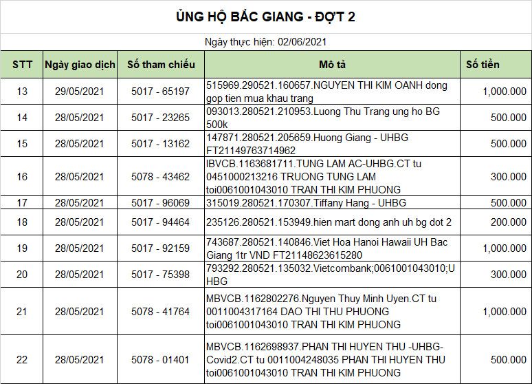 • Theo thống kê đến 21.00 ngày 2.6.21 số tiền ủng hộ cho Bắc Giang đợt 2 (bao gồm 8.050.000 đ từ chương trình UHNV YT Điện Biên chuyển sang) là  60.350.000 đ