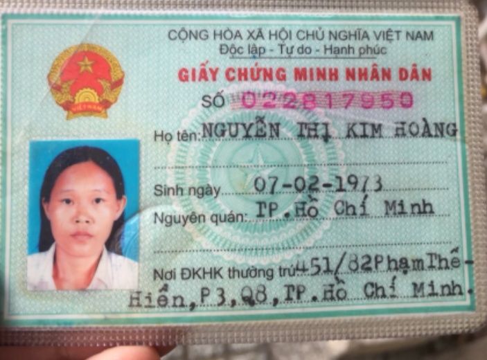 Họ tên Nguyễn Thị Kim Hoàng sinh Năm 1973. Quê quán thành phố Hồ Chí Minh. Nơi cư trú451/82 Phạm Thế Hiển phường 3 quận 8.