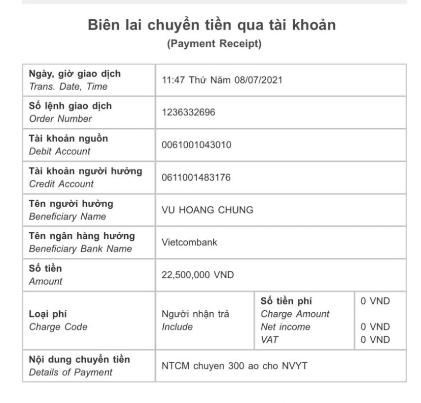 Tk Vũ Hoàng Chung số 0611001483xxx NH VCB chi nhánh Ba Đình Hà nội.
