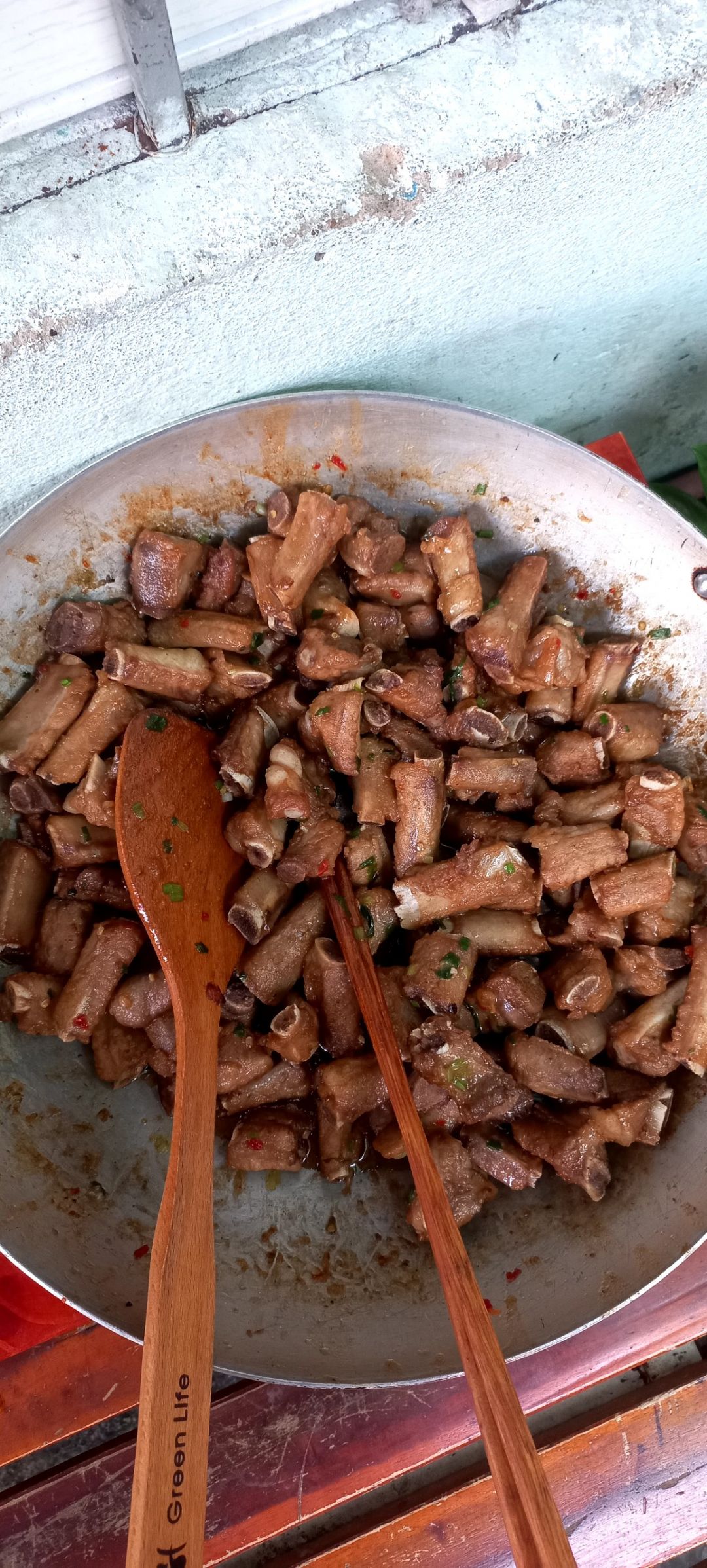 Sáng nấu 245 phần cơm cá saba chiên; rau muống xào tỏi; canh cải ngọt+ sườn que.