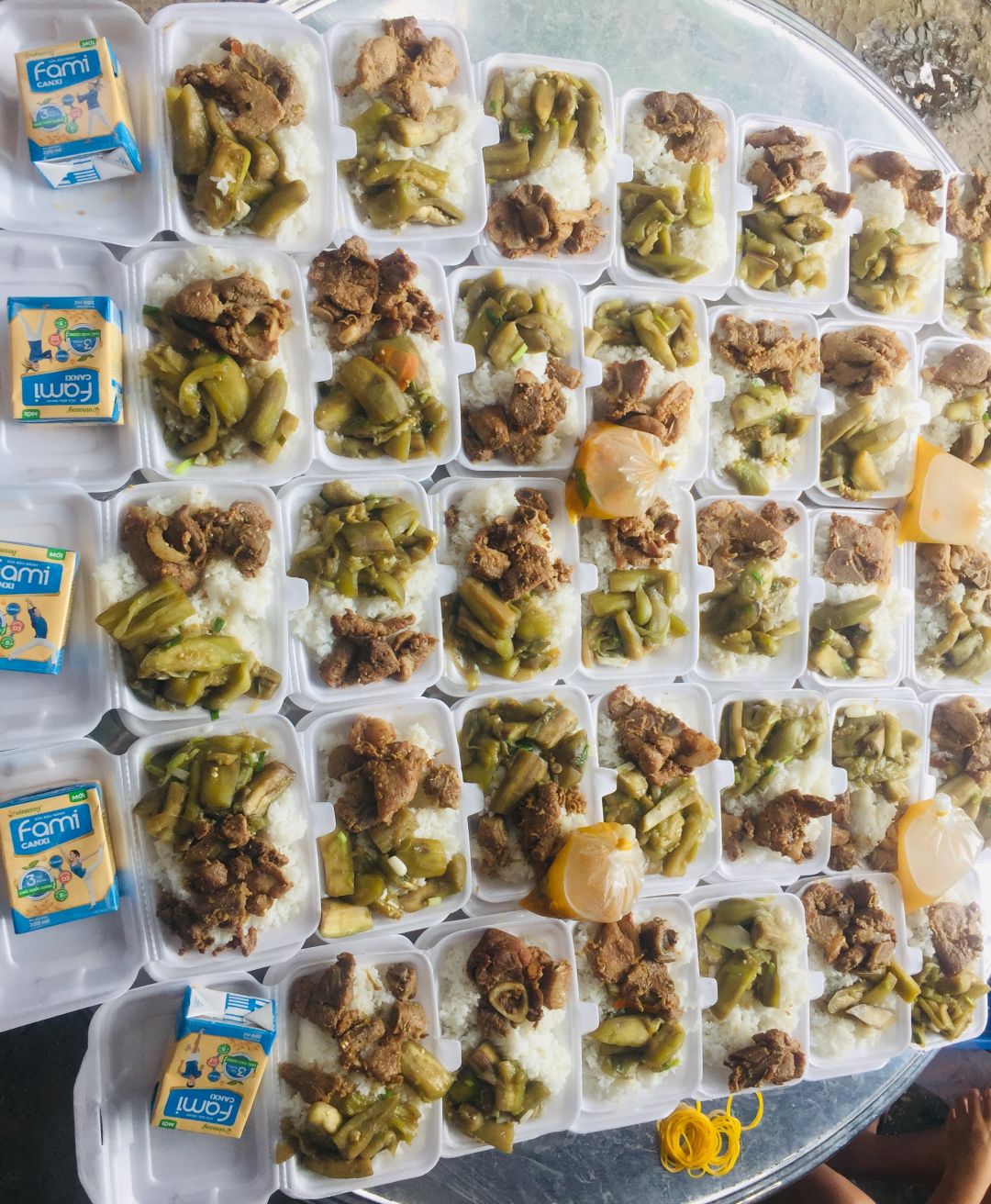 Chiều nấu 170 phần cơm thịt cốt lết nướng sả ớt; cà tím xào; canh bí đỏ+ đậu phộng; sữa Fami