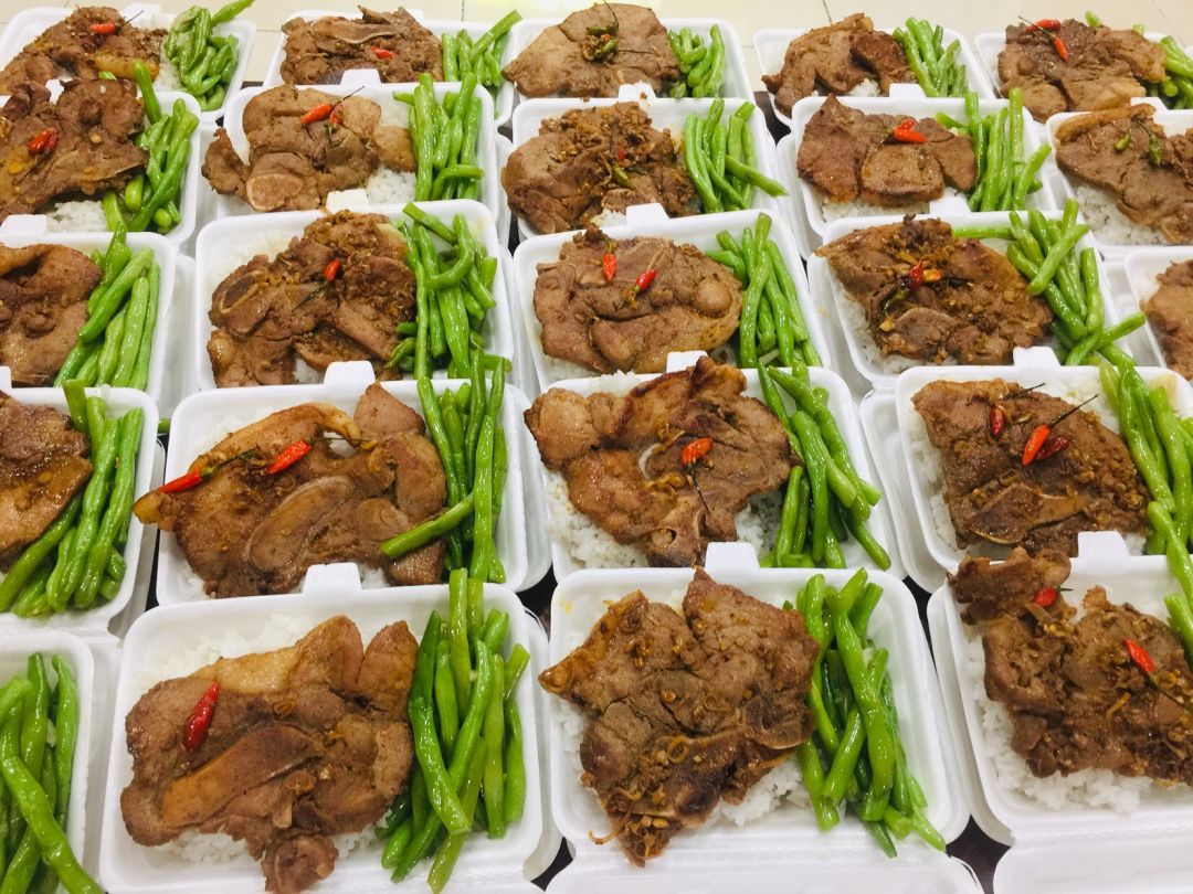 Sáng nấu 180 phần cơm thịt cốt lết nướng sả ớt; canh bí đao+ sườn que; rau bắp cải+ su su+ cà rốt+ ớt chuông xào; sữa Fami.