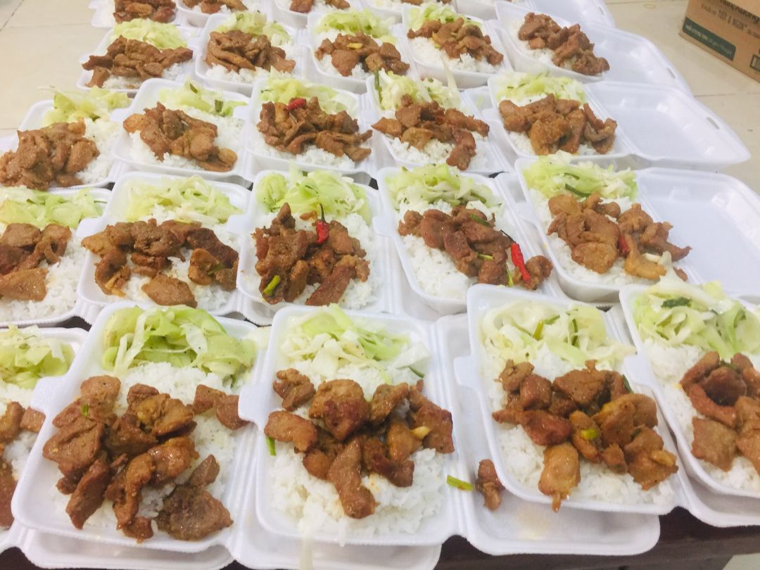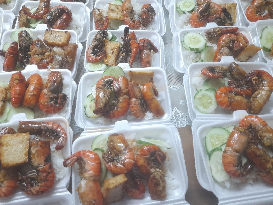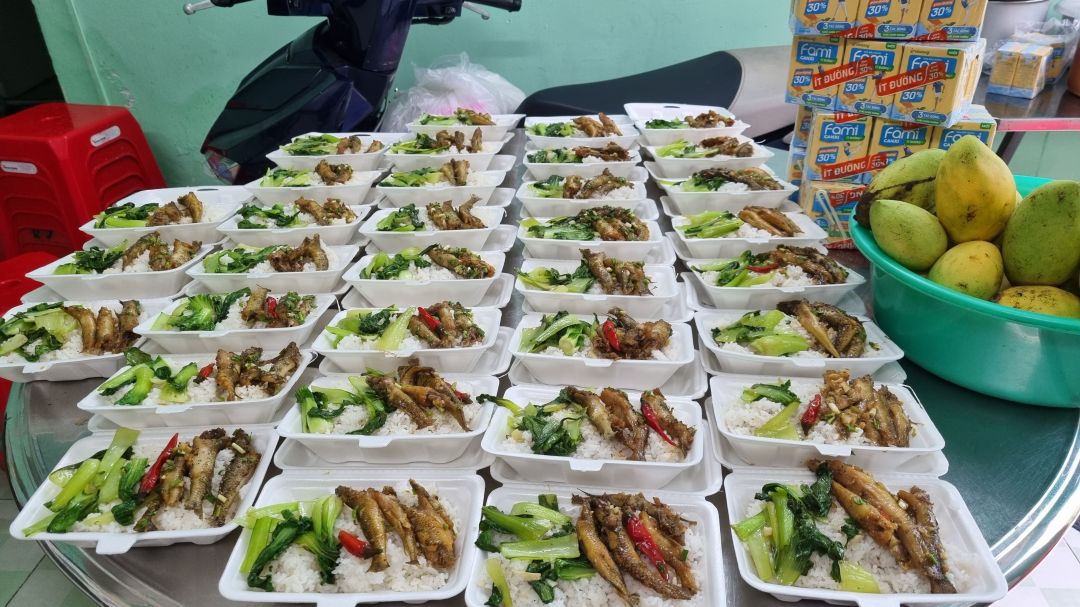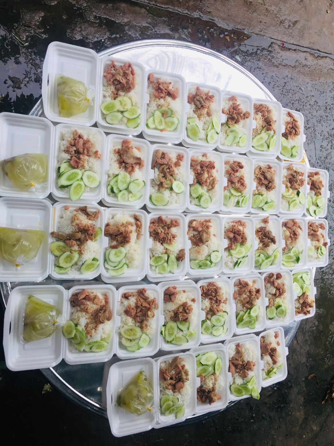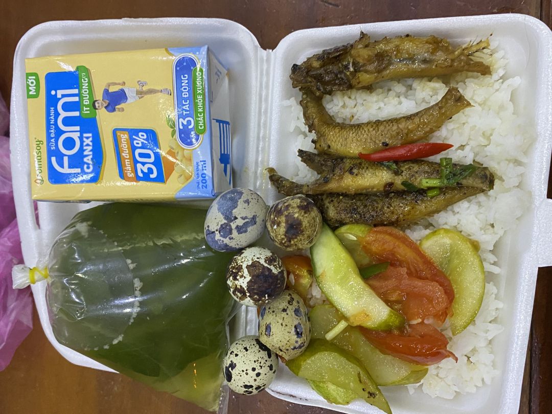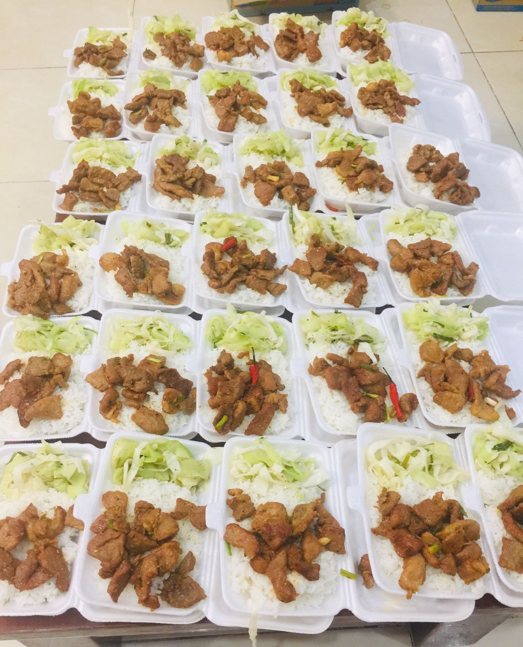 Sáng nấu 160 phần cơm tôm thịt rim tiêu; bắp cải+ cà rốt xào tỏi+ sữa Fami.