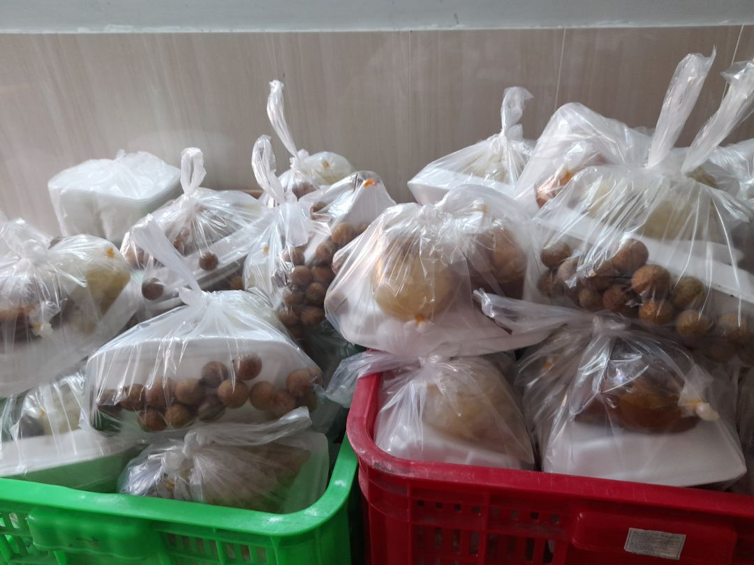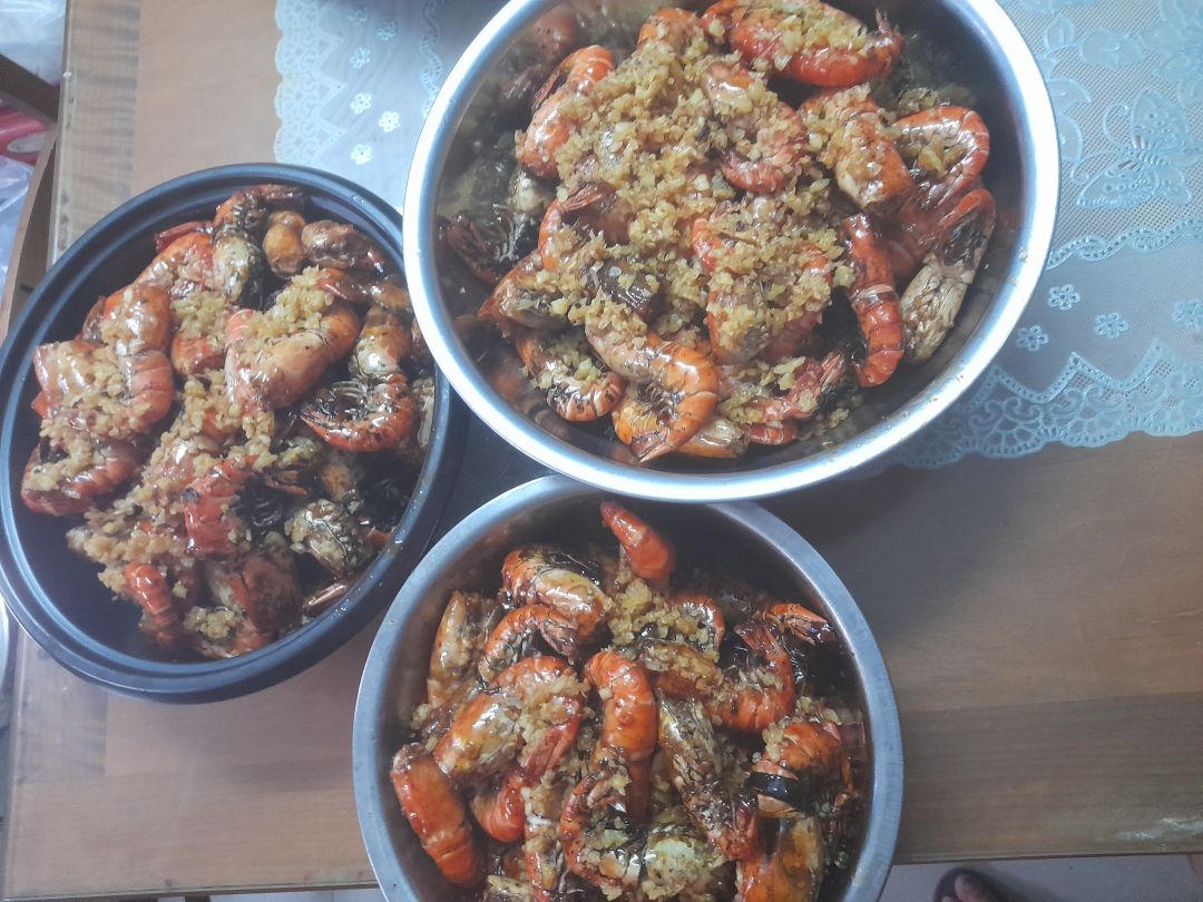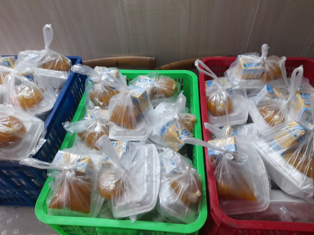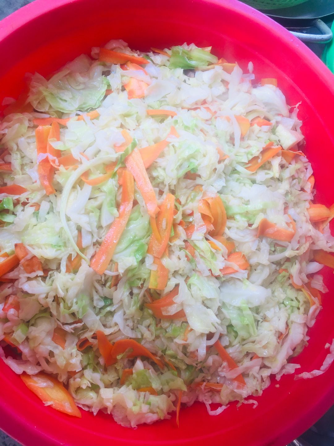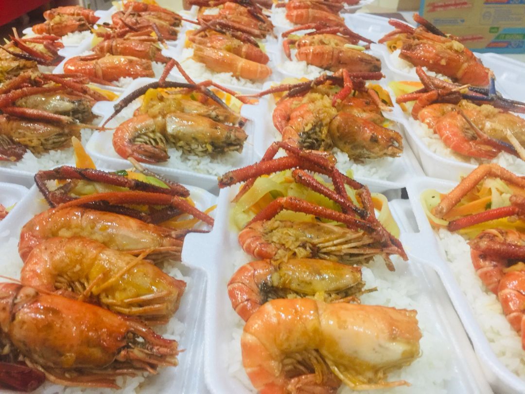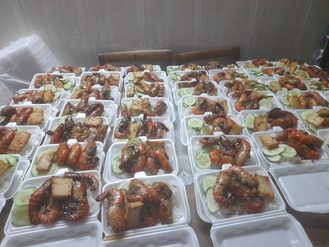 Sáng nấu 160 phần cơm tôm thịt rim tiêu; bắp cải+ cà rốt xào tỏi+ sữa Fami.