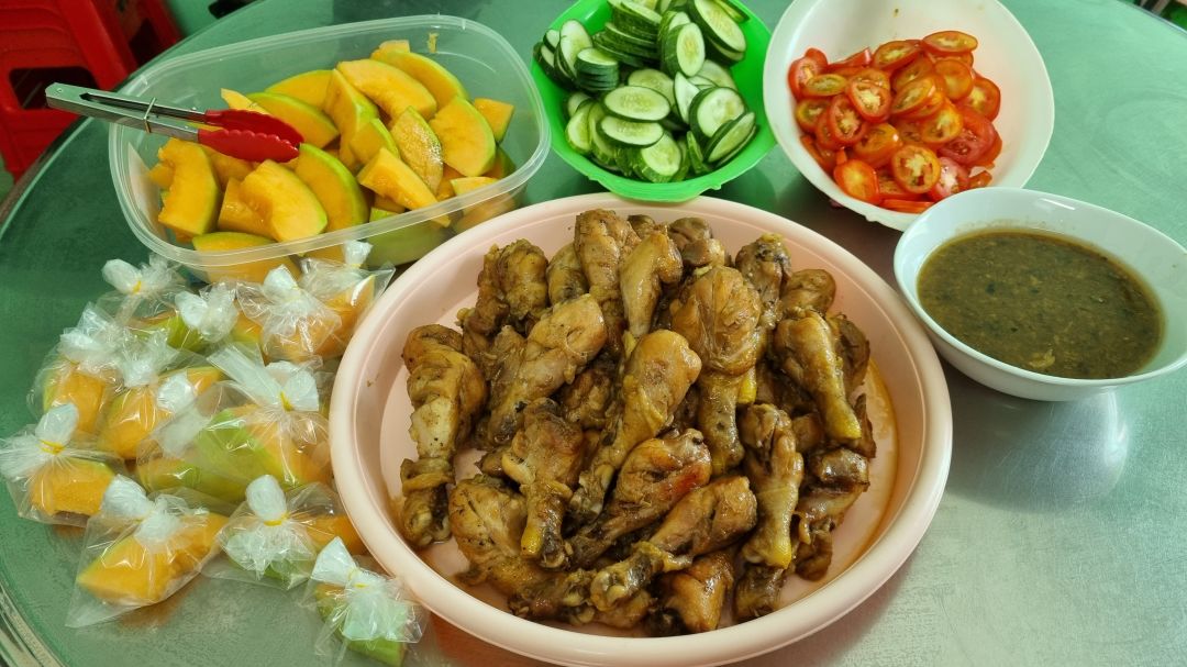 Bép nhà yêu thương của Lathuvang hôm nay: 38 suất với Đùi gà rô ti. Cà chua dưa leo. 1 hộp sữa đậu nành Fami. Tráng miệng: dưa lưới.