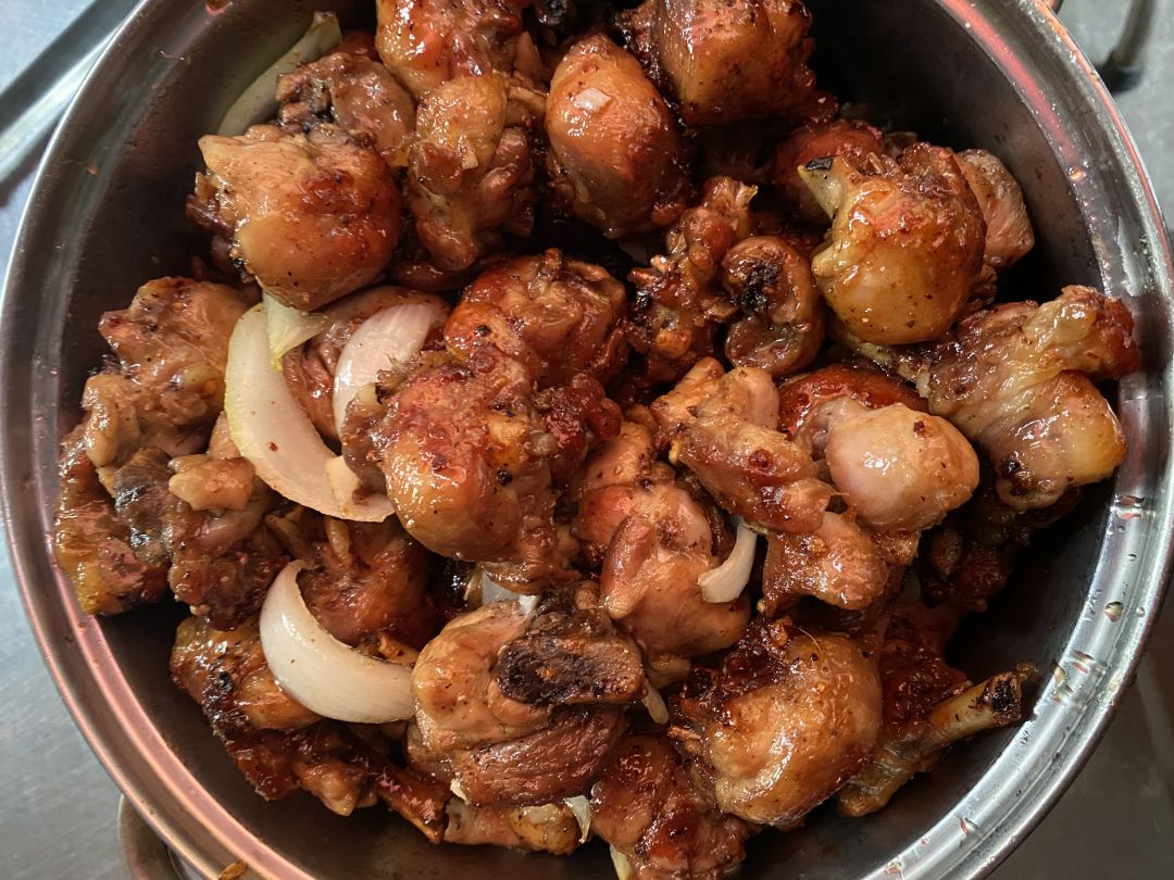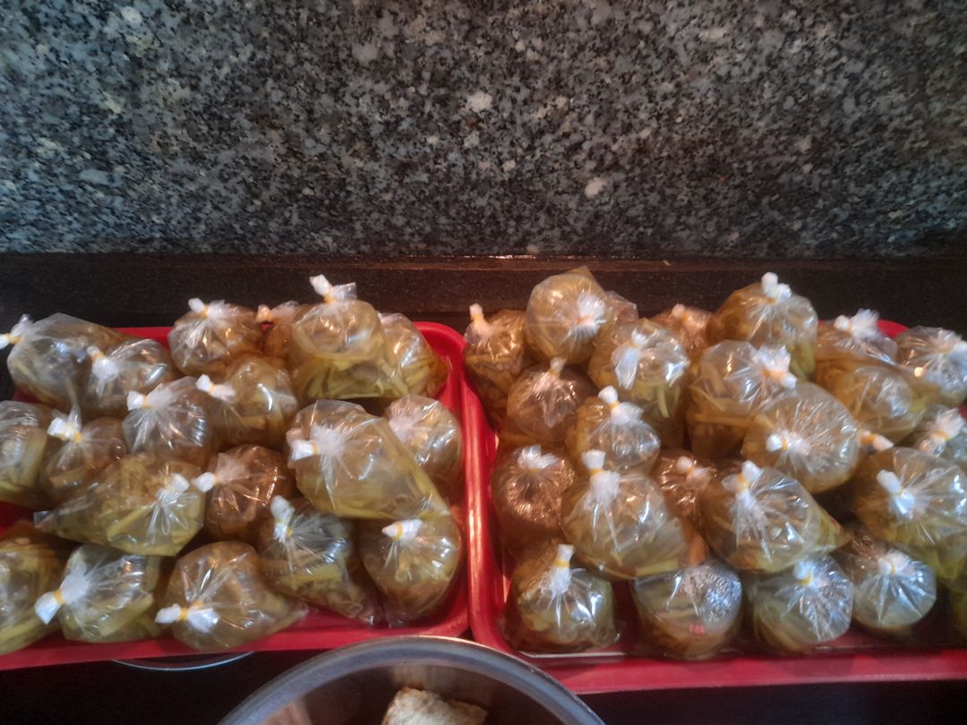 12/8, bếp nhà sonnynhan nấu 60 phần cơm chiều, thực đơn : gà chiên nước mắm, cà tím xào, canh mồng tơ nấu với mướp và thịt bằm, sữa Fami.