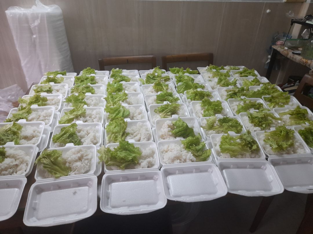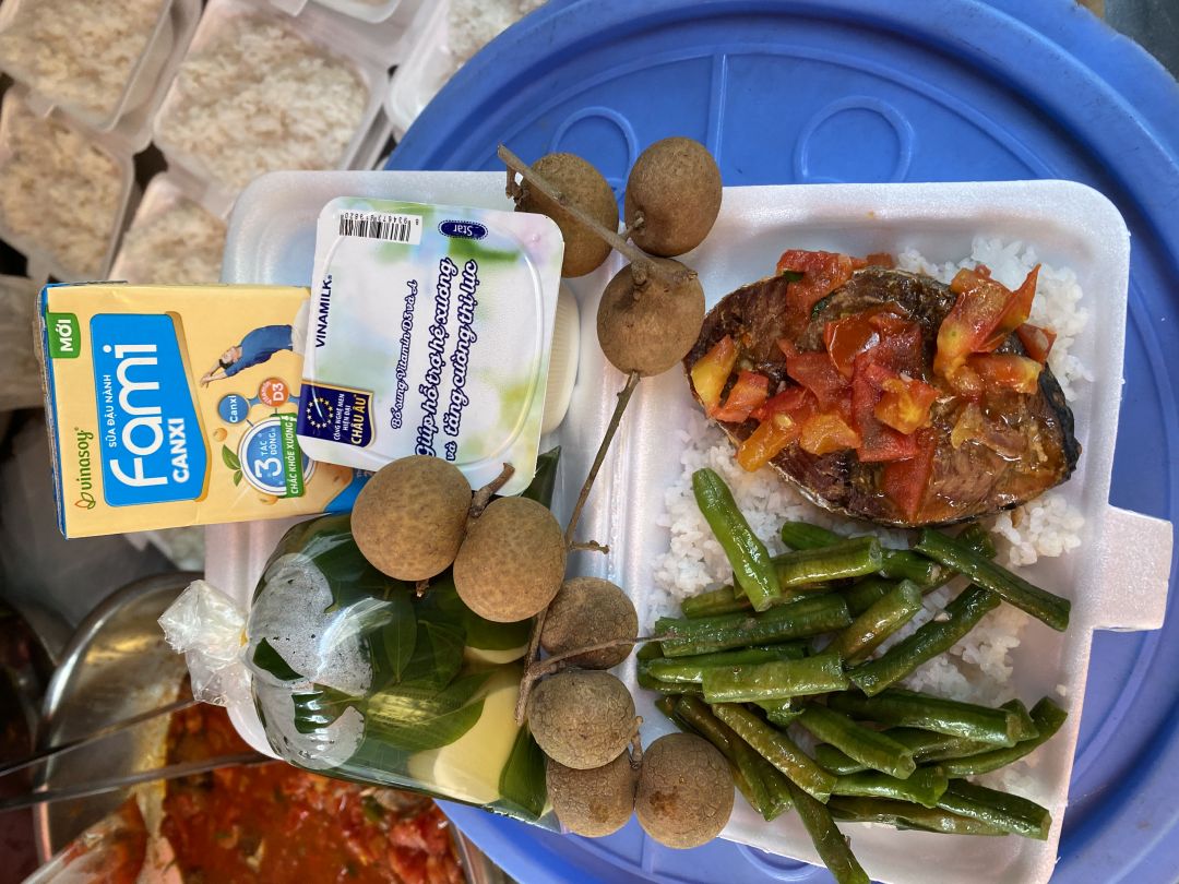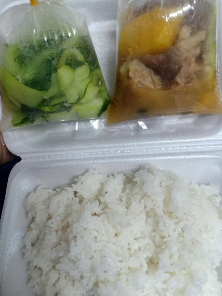 3/8, bến nhà Sonnynhan nấu 60 phần cơm chiều cho khu cách ly Bình Tân. Thực đơn : cá ngừ chiên sốt cà, canh bồ ngót nấu đậu hủ, đậu đủa xào, sữa Fami, sữa chua Vinamilk, tráng miệng nhãn.