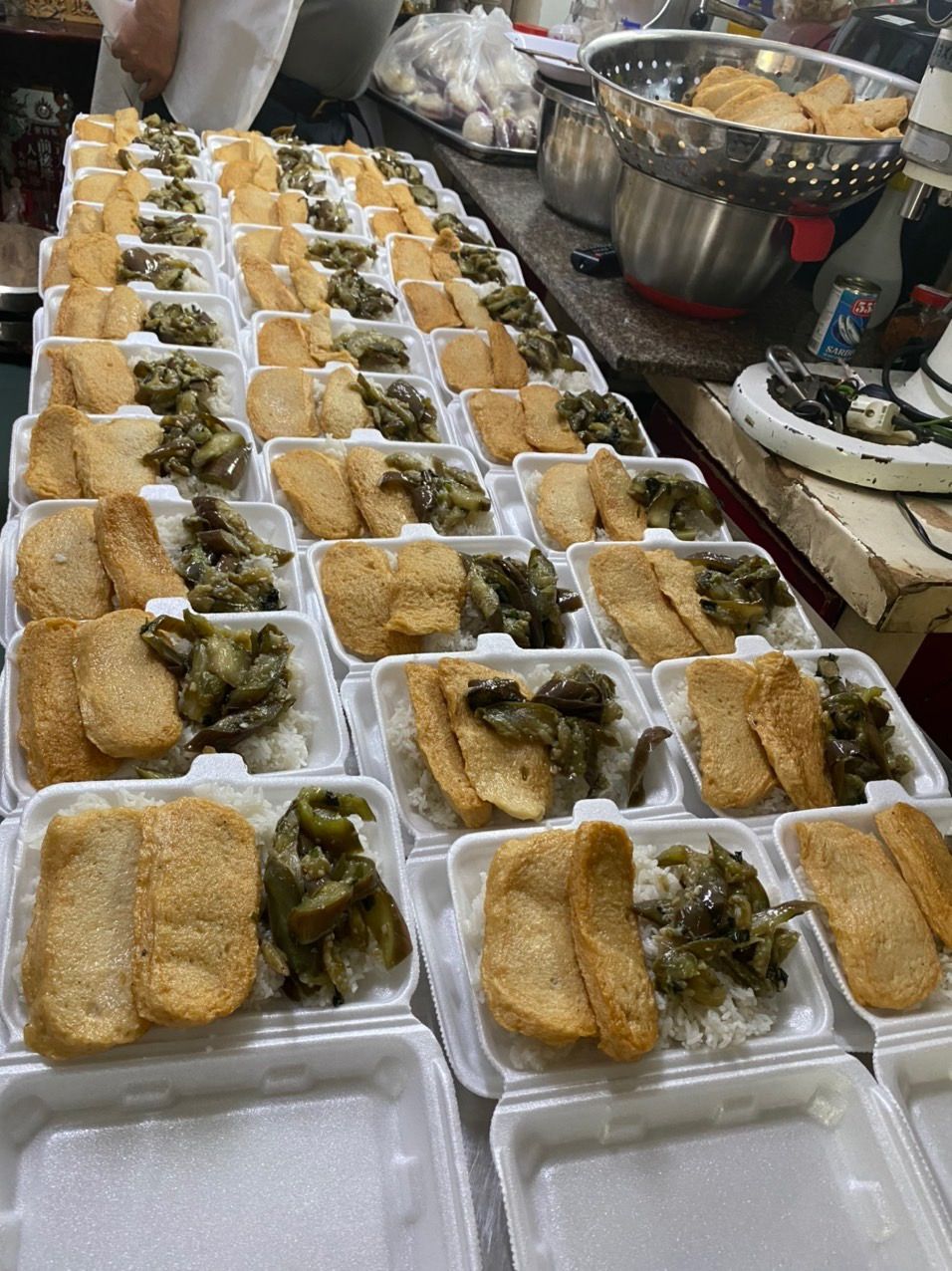 Sáng nấu 150 phần cơm cá chiên sốt cà, ớt chuông xào, sữa Fami.