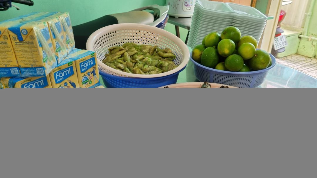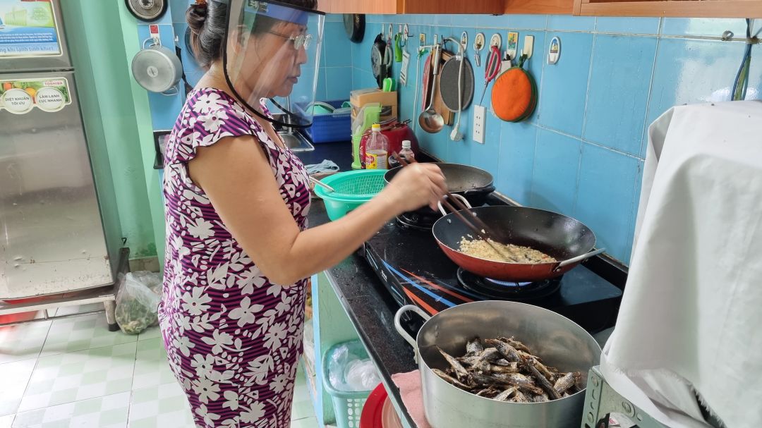 Buổi sáng đầu tuần trong gian bếp của cô Ngọc Anh và Lâm Khang đã sáng lửa từ sớm để chuẩn bị 60 phần cơm cho HCDC Hồ Chí Minh và 10 phần cơm cho Bệnh viện Quận 1.