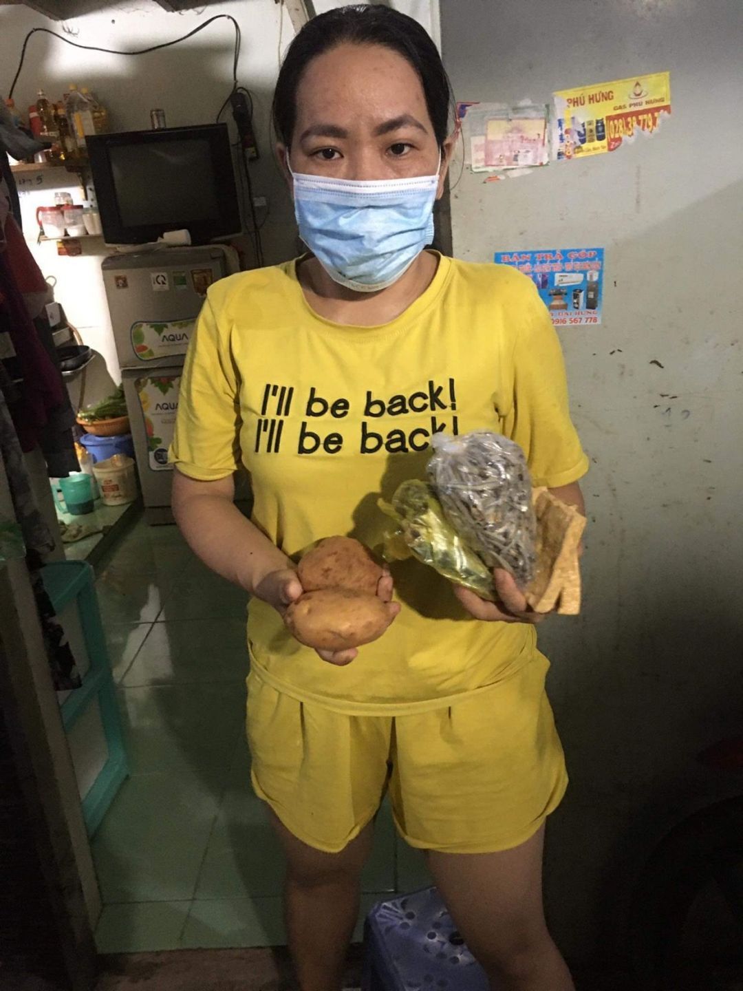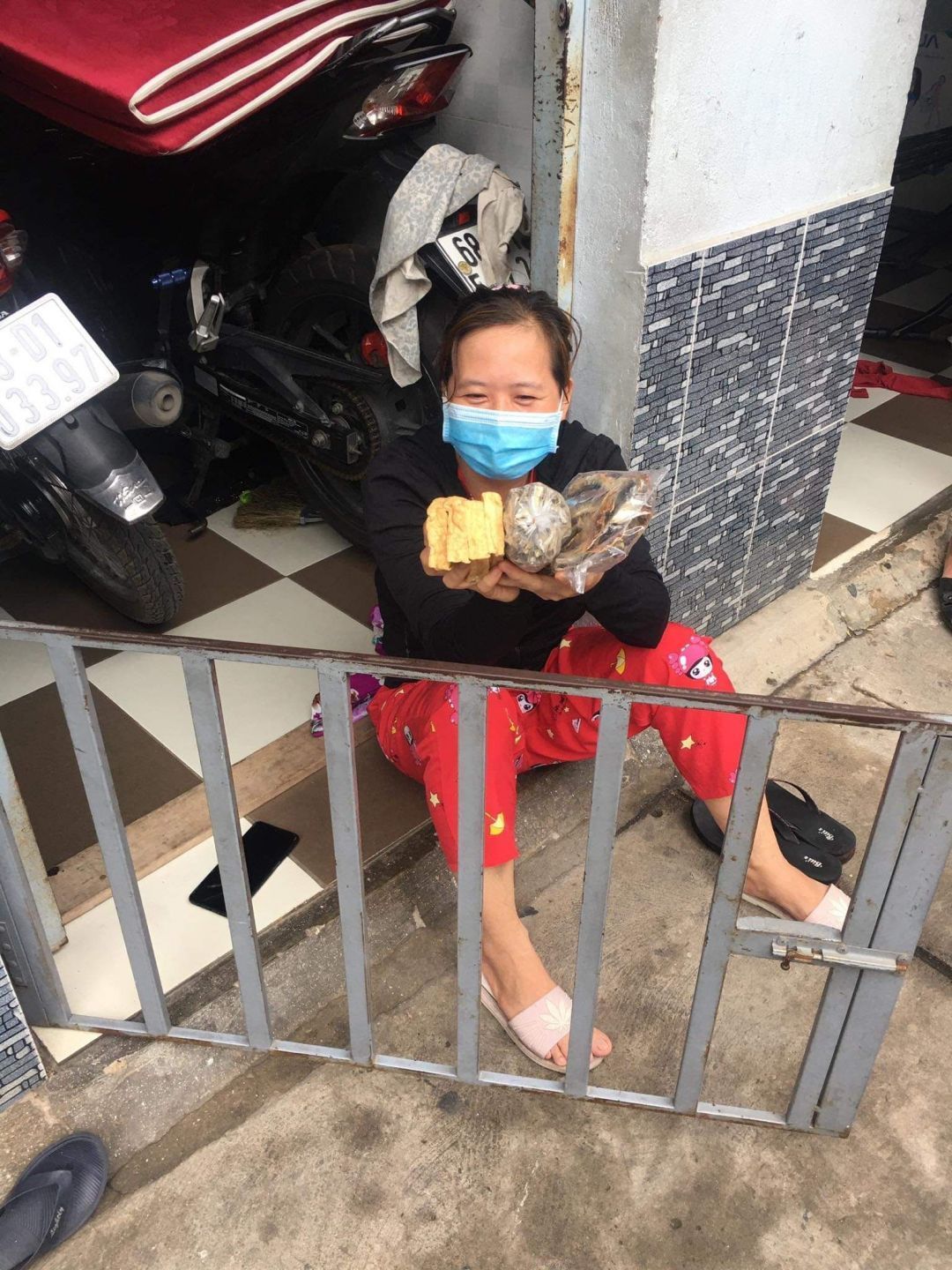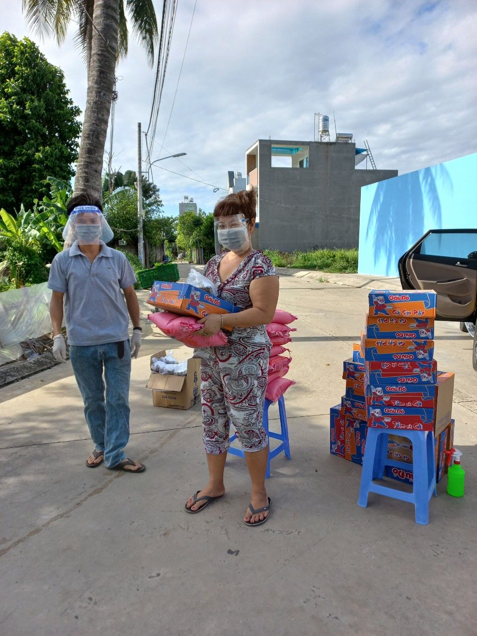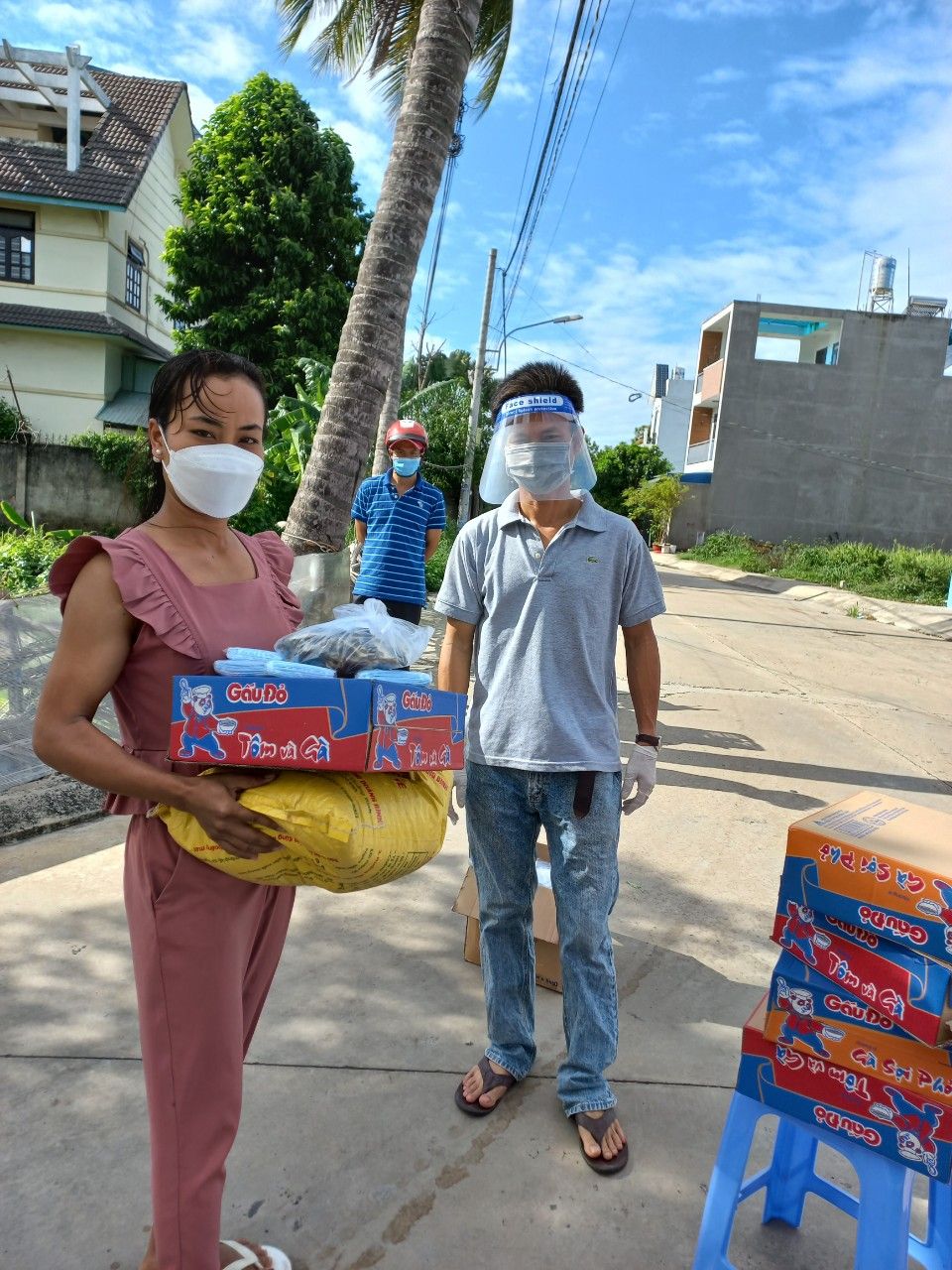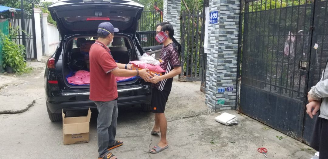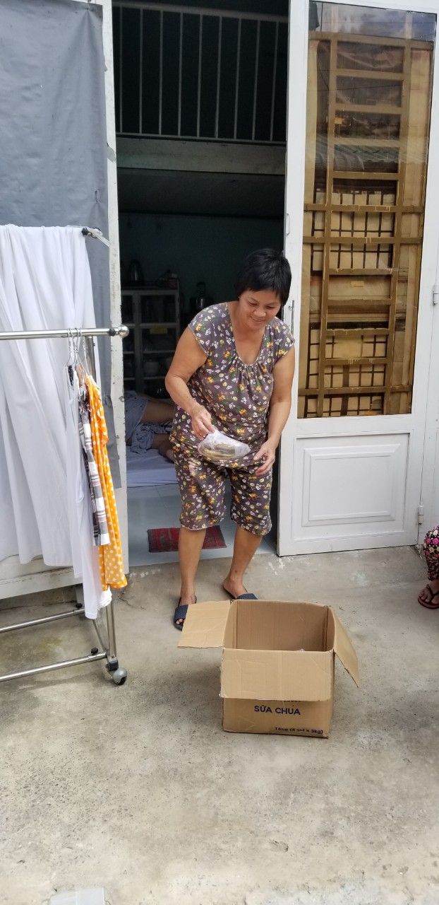 Và chuyển 83 phần quà đến 83 phòng trọ tại 126 Trần Thanh Mại, Bình Tân, mỗi phần bao gồm : 2kg gạo, 10 gói mì, 5 trứng vịt, 4 miếng đậu hủ, bịch khô cá cơm 200gr, khô cá chỉ vàng do bà con Quảng Trị tặng, 200 bịch sữa cho 20 bé, 100kg cải xanh, khoảng 50kg củ các loại.