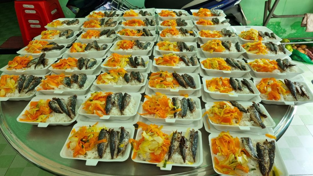 Hôm nay 27/7, bếp nhà Sonnynhan vẫn nấu 60 phần cơm cho khu cách ly y tế tập trung Hương Sen. Thực đơn : dưa lèo xào, canh súp sườn, cá nục chiên, đậu hủ chiên xã ớt, sữa Fami và chuối.