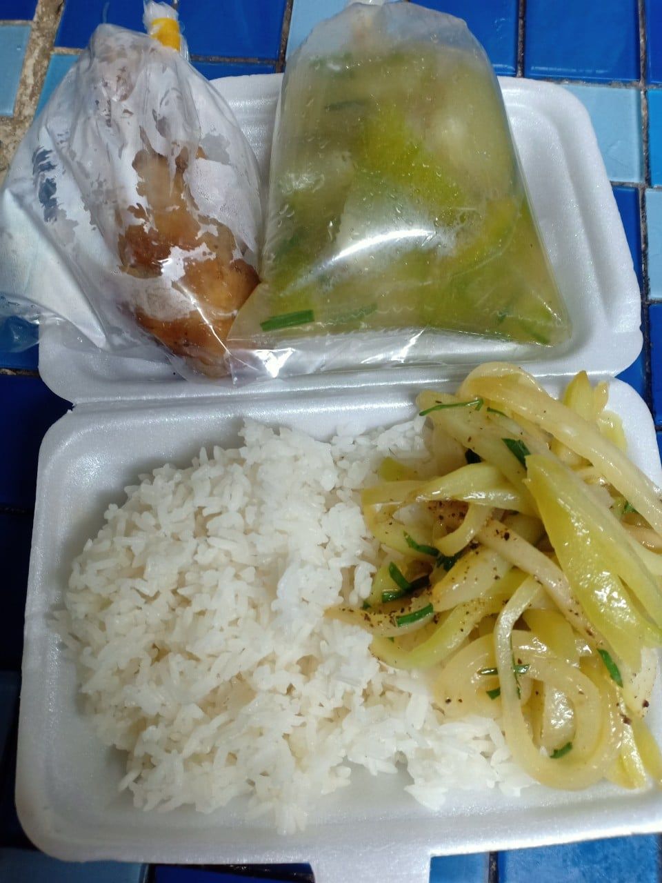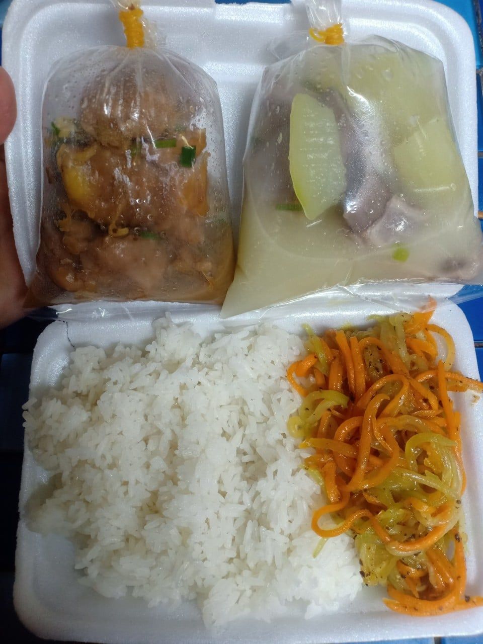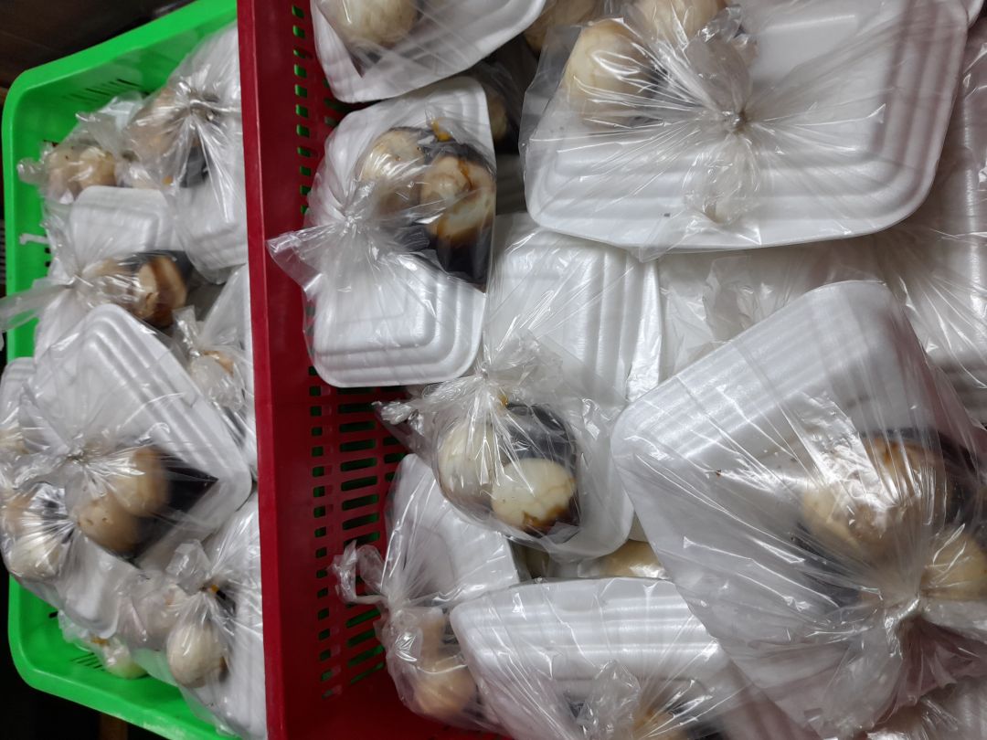 Sáng nấu 265 phần cơm chả cá sốt cà+ hành tây; cải thảo+ bắp cải+ cà rốt xào; canh mướp+ sườn que và sữa Fami cho người già, trẻ em.