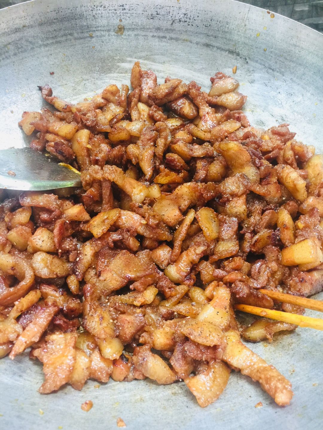 Bên quán cơm có một ít thịt lụi để làm bún thịt lụi nên Lê Tuấn Tú đã đưa cho Mai Trâm về làm một buổi ăn.