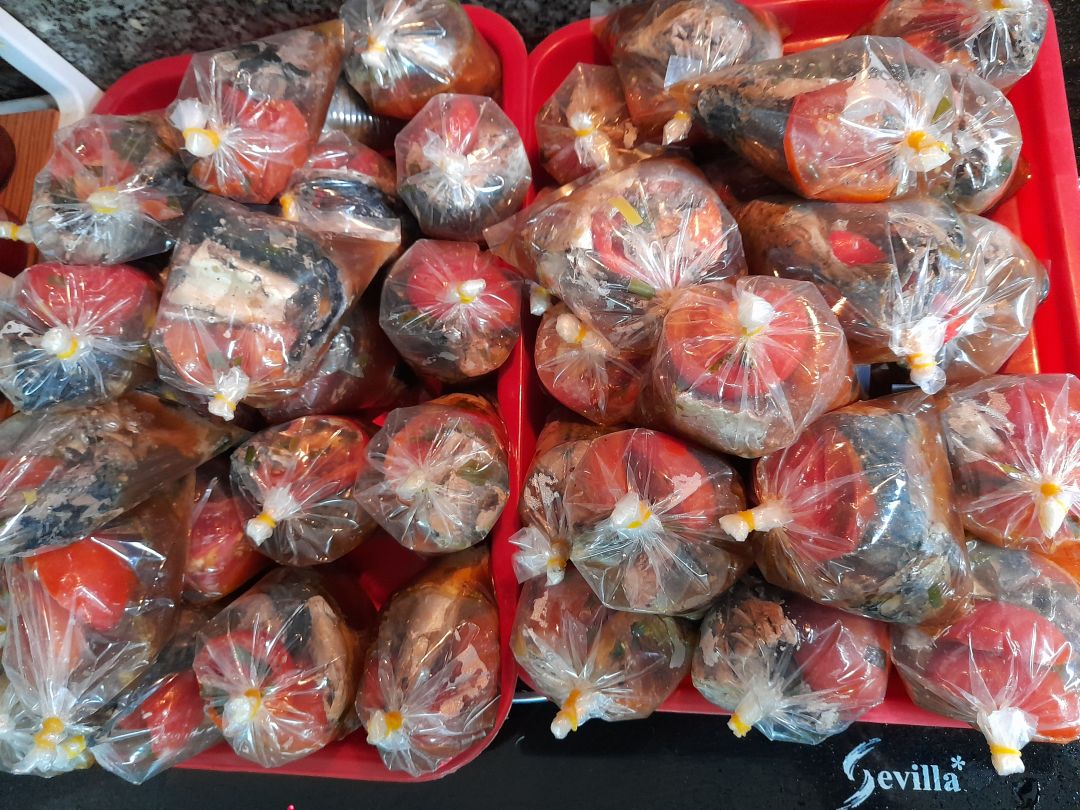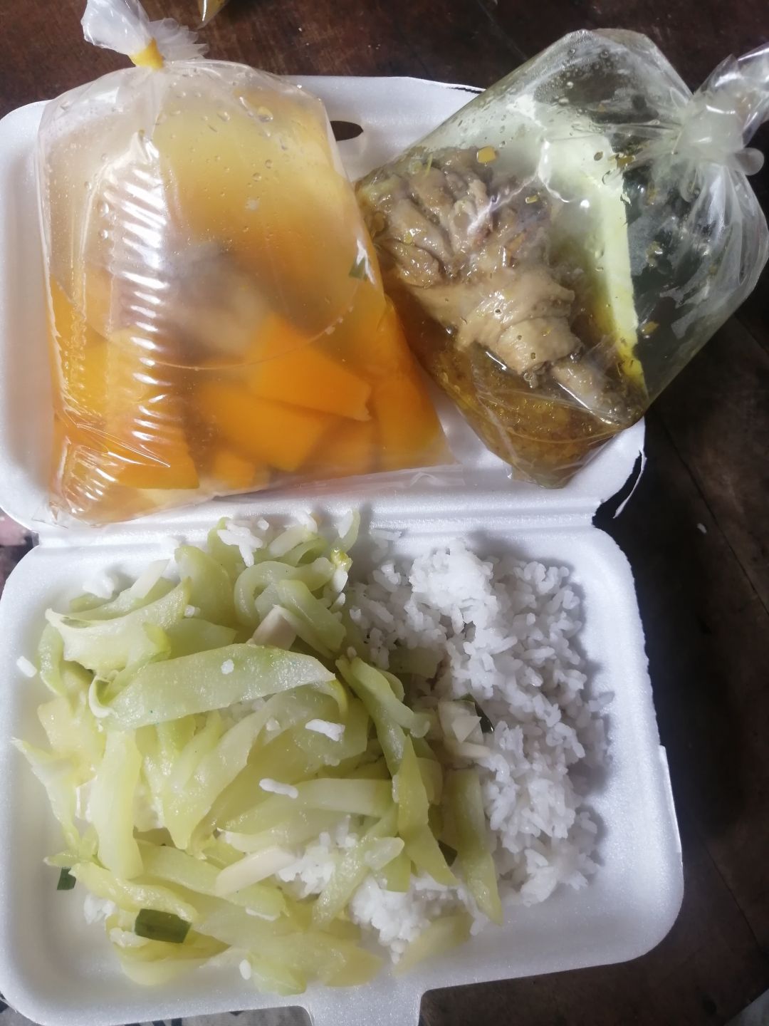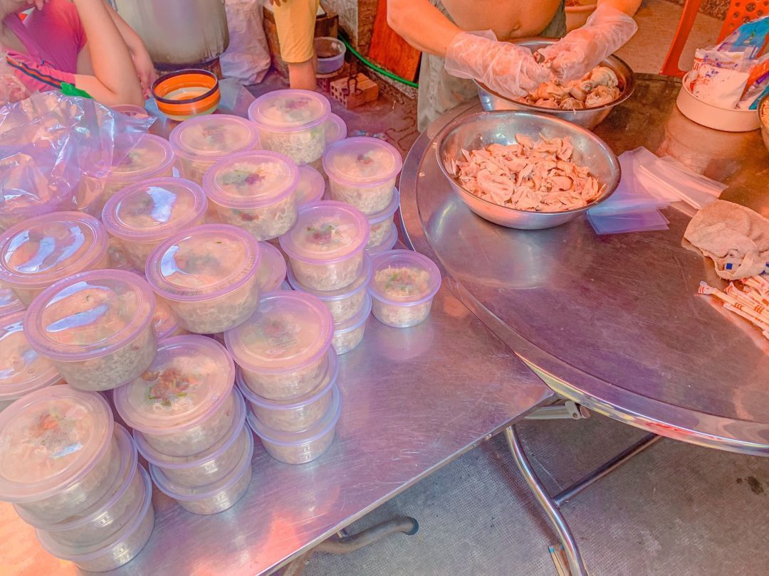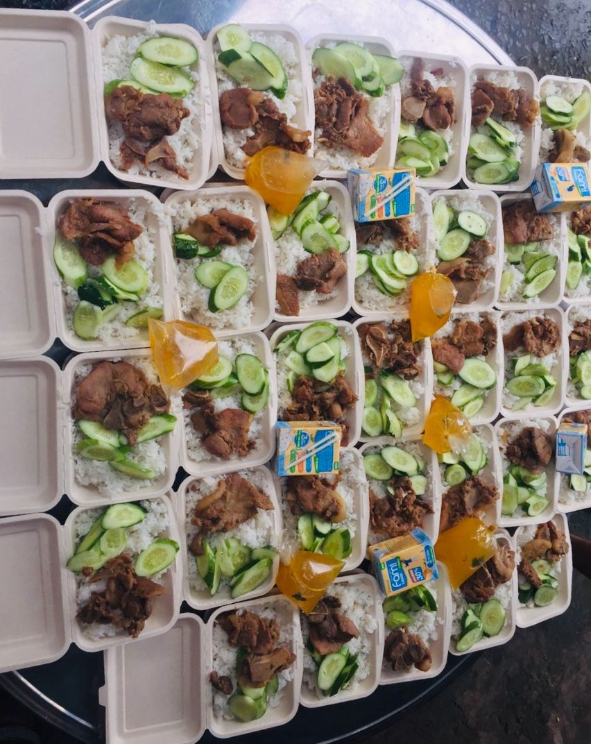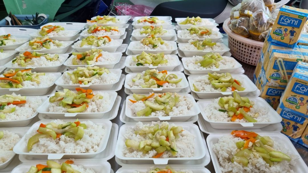 Chiều nấu 265 phần cơm thịt cốt lết ram tỏi ớt; dưa leo cắt lát; canh bí đỏ+ sườn que và sữa Fami cho người già và con nít.
