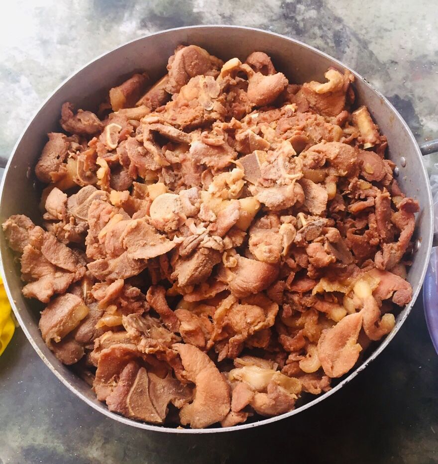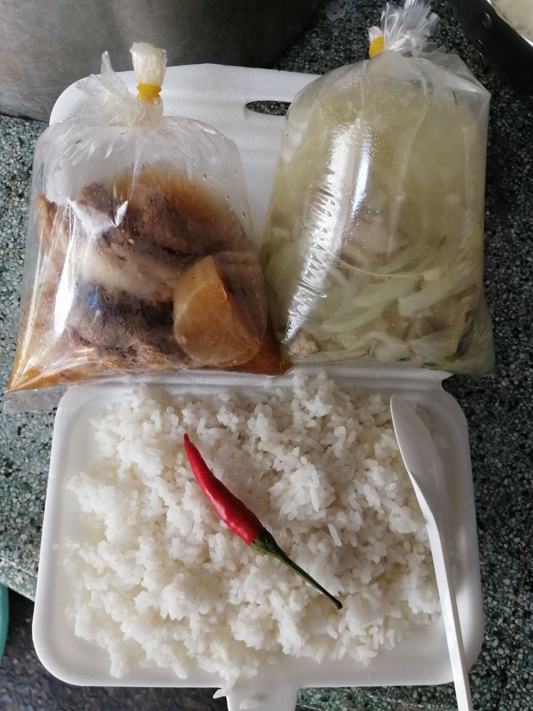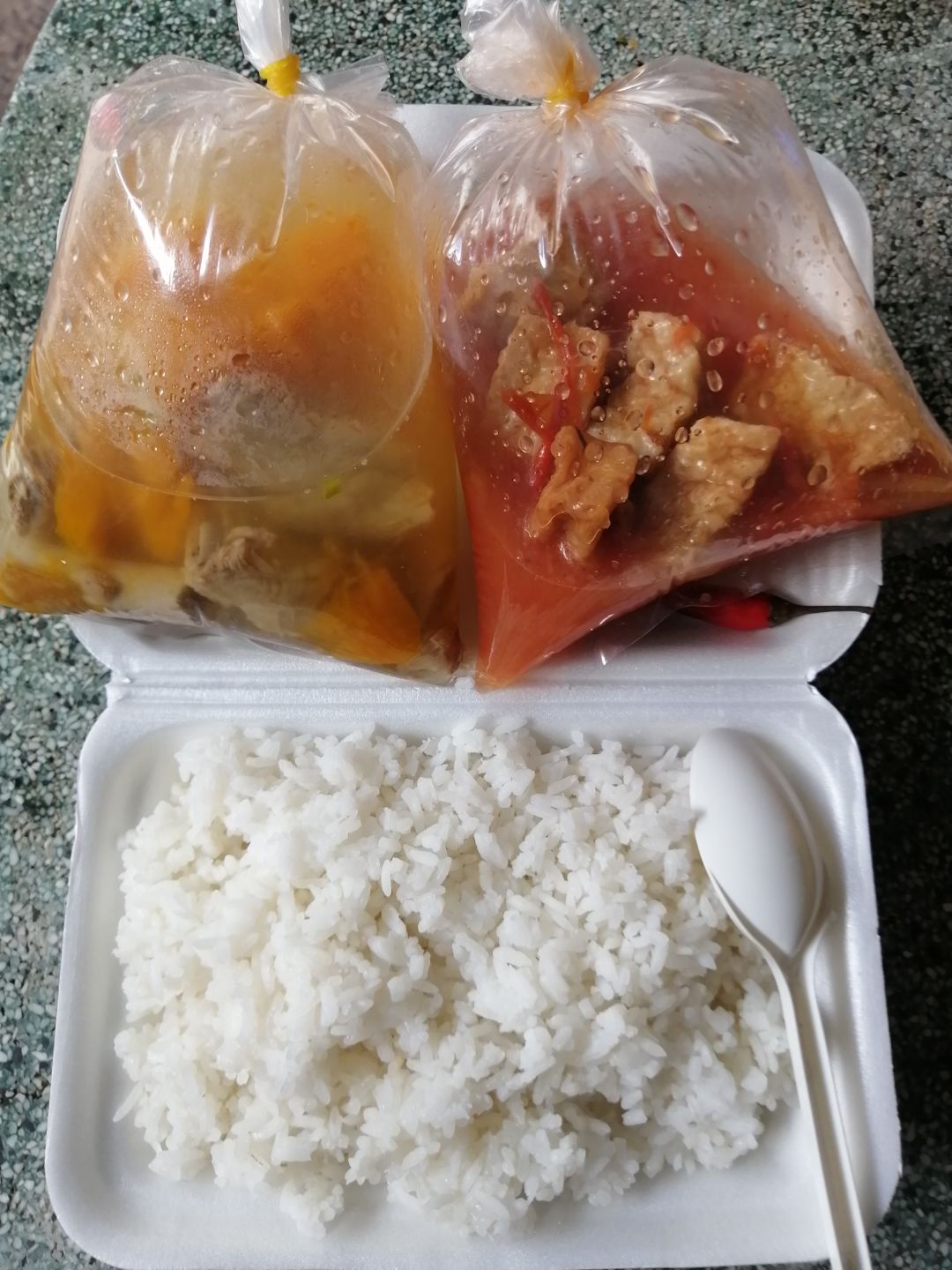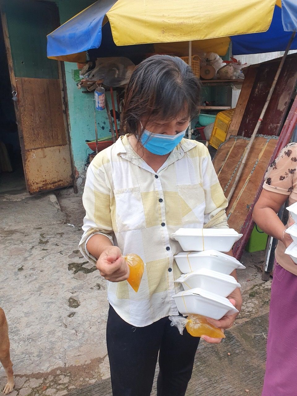 Chiều nấu 265 phần cơm thịt cốt lết ram tỏi ớt; dưa leo cắt lát; canh bí đỏ+ sườn que và sữa Fami cho người già và con nít.