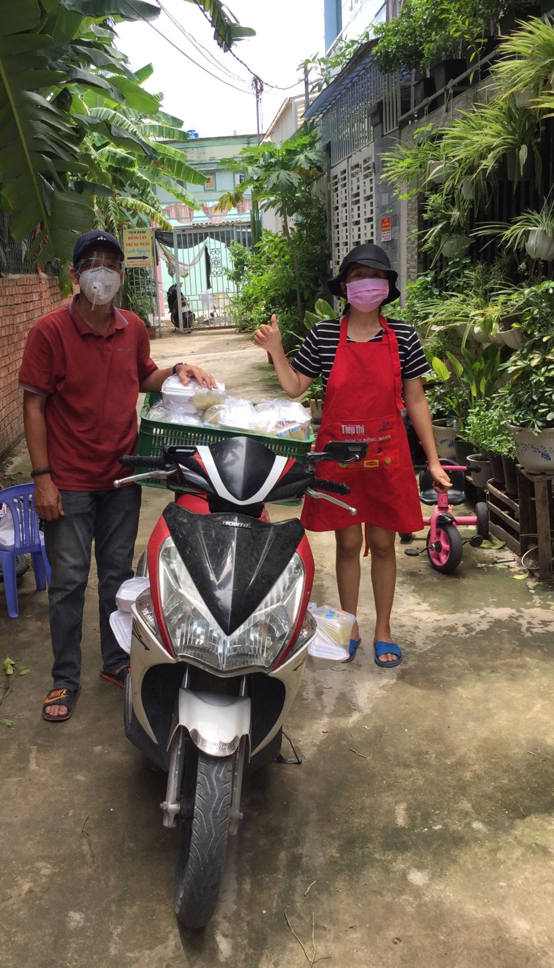 Giao nhận cơm tại Bệnh viện Dã chiến số 08. Các bạn dân quân hỗ trợ việc vận chuyển và phân chia suất ăn lên các tầng Những Người Bạn lầu. Một bộ phận mặc đồ bảo hộ sẽ phụ trách việc đưa các suất ăn đến các tầng trên.
