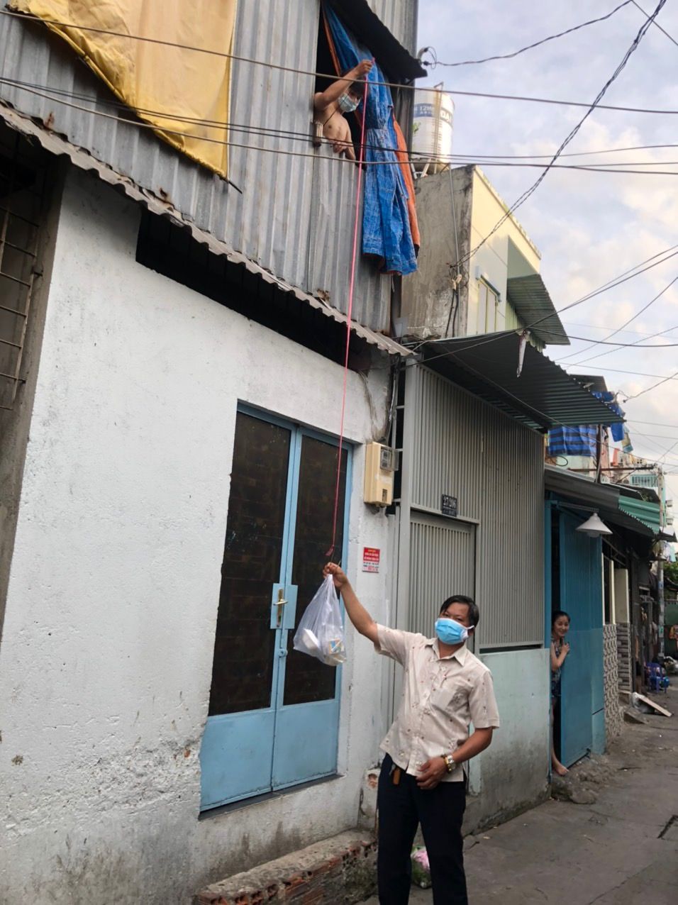 Giao nhận cơm tại Bệnh viện Dã chiến số 08. Các bạn dân quân hỗ trợ việc vận chuyển và phân chia suất ăn lên các tầng Những Người Bạn lầu. Một bộ phận mặc đồ bảo hộ sẽ phụ trách việc đưa các suất ăn đến các tầng trên.