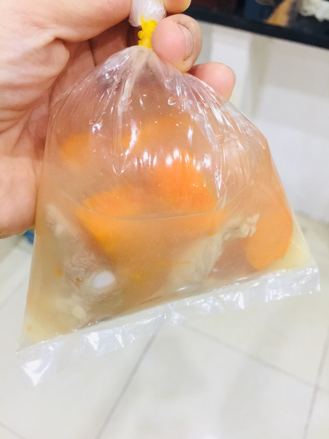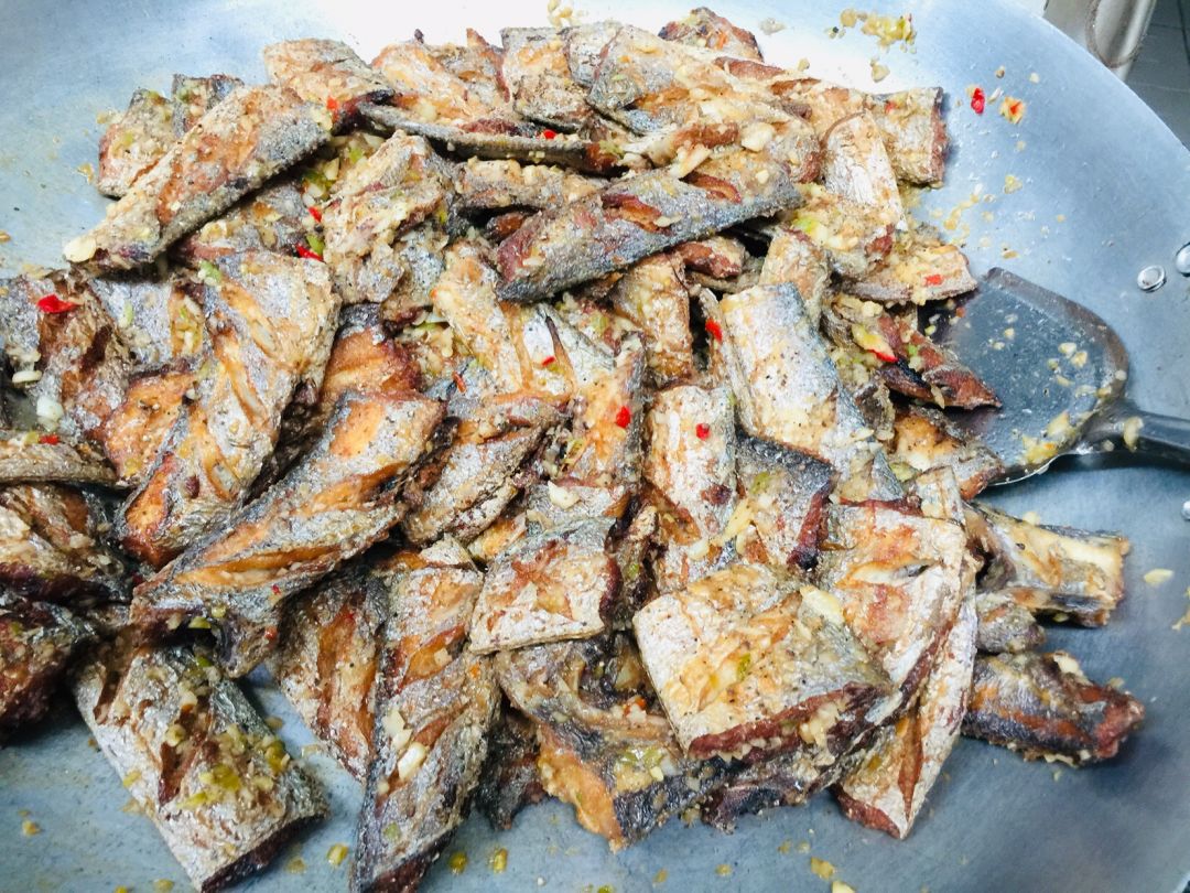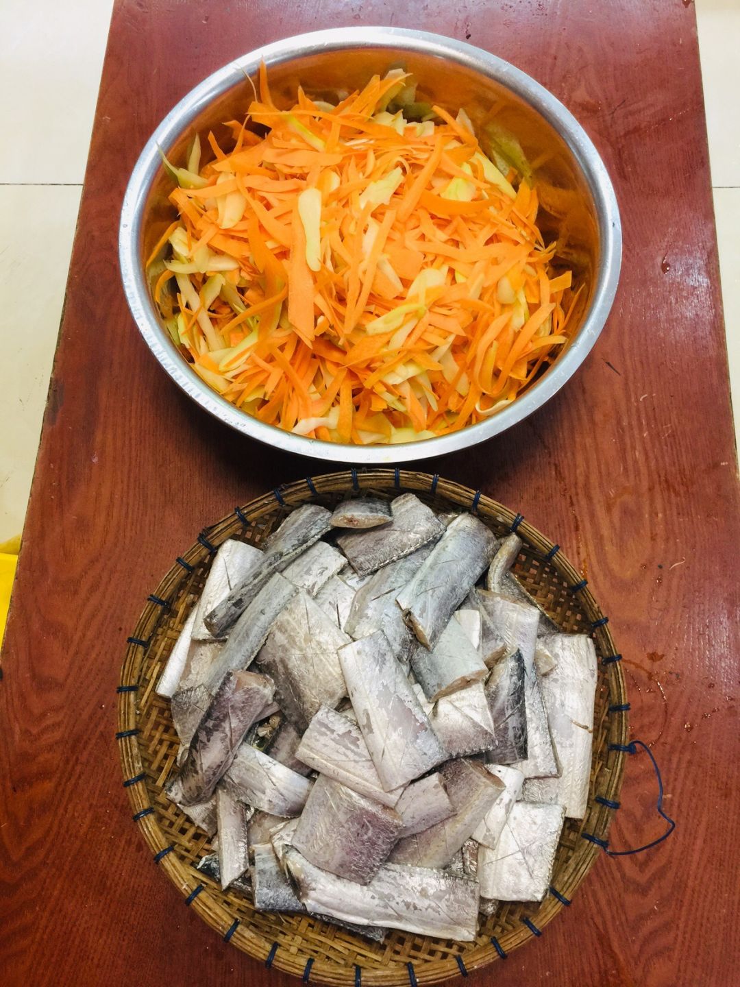 Sáng nấu 190 phần cơm, thực đơn gồm : bắp cải+ cà rốt+ hành tây xào, canh bí đỏ sườn que, cá khô chiên rim mắm tỏi ớt; sữa Fami+ chanh.
