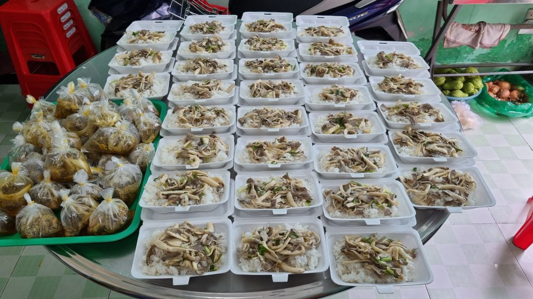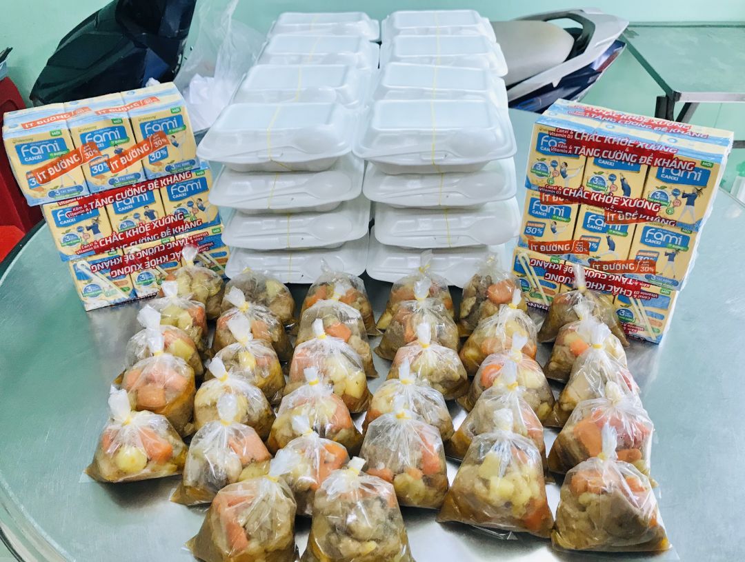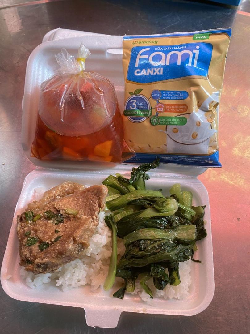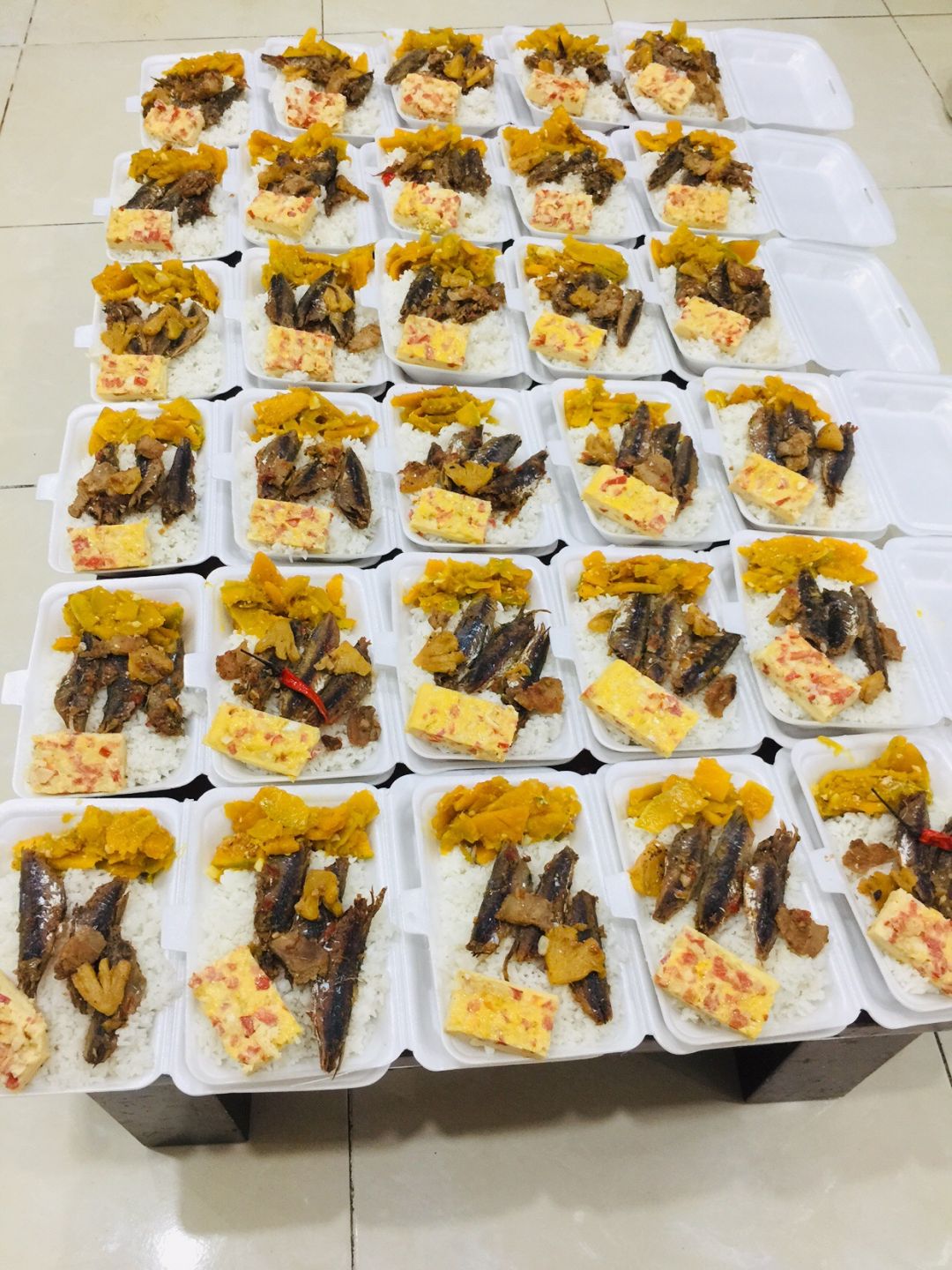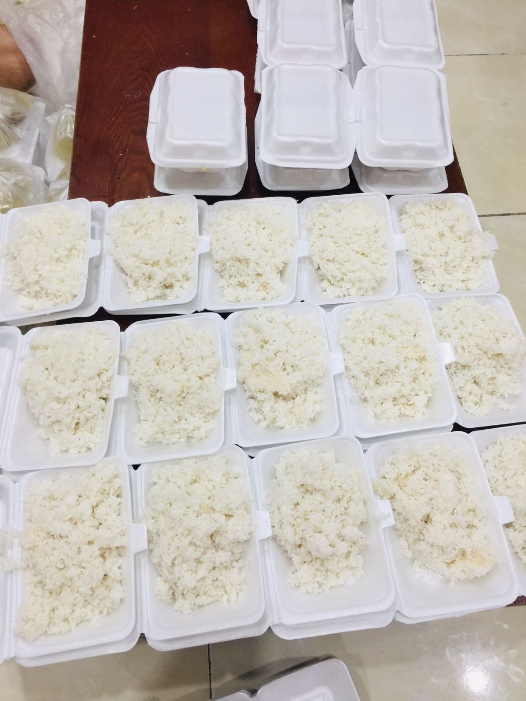 Chiều nấu 160 phần cơm, thực đơn gồm: thịt gà kho sả ớt, cá khô rim chiên mắm tỏi ớt, canh mồng tơi nấm, nấm xào hành tây+ cà rốt+ mũi heo; sữa Fami+ chanh đến bà con phòng trọ khó khăn ở khu phong toả và cách ly!