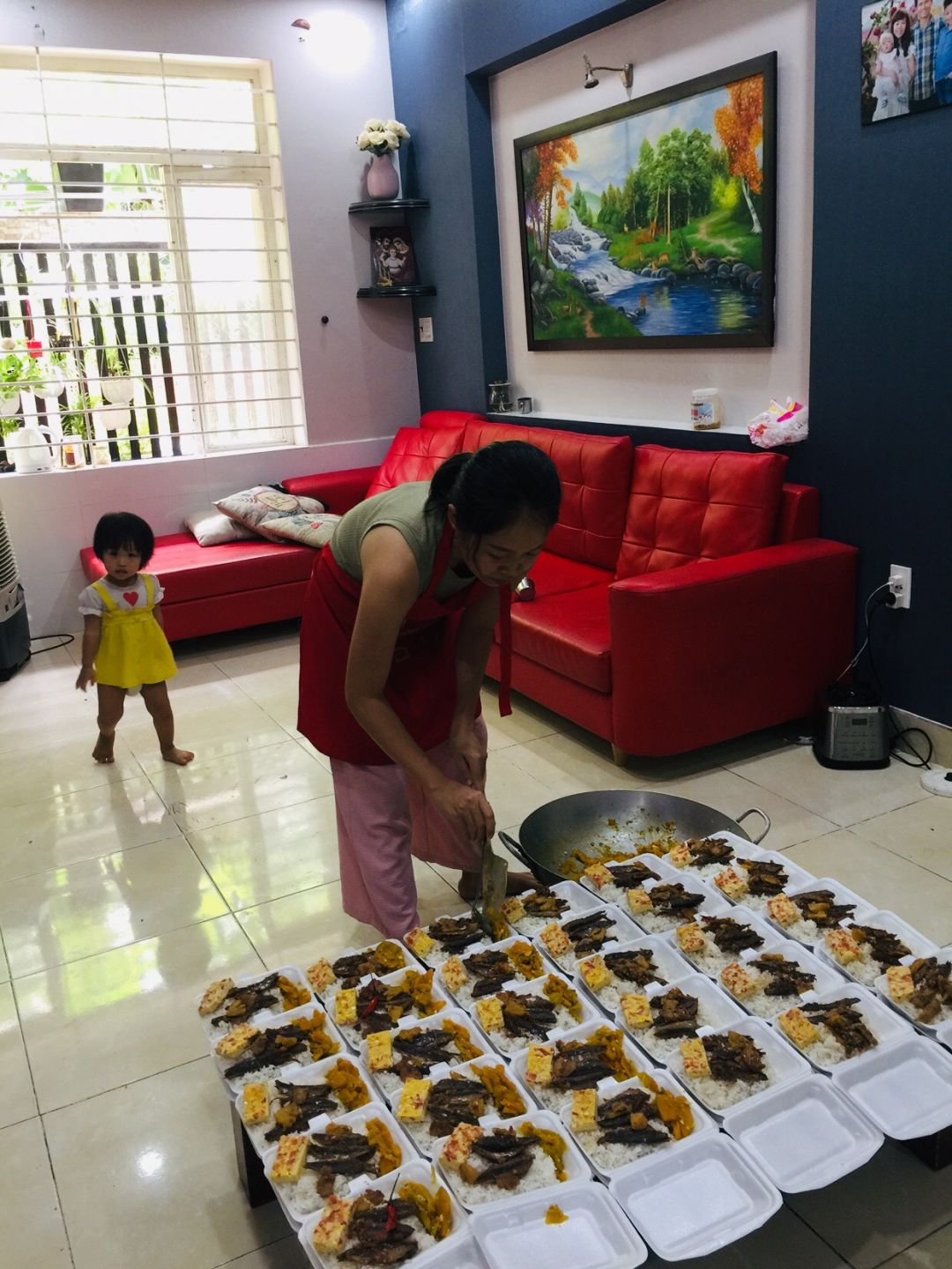 Là một trong số những người tham gia đầu tiên của Bếp nhà yêu thương, chị đã vất vả chuẩn bị những phần cơm ngon lành trao đến người khó khăn trong khu phố.