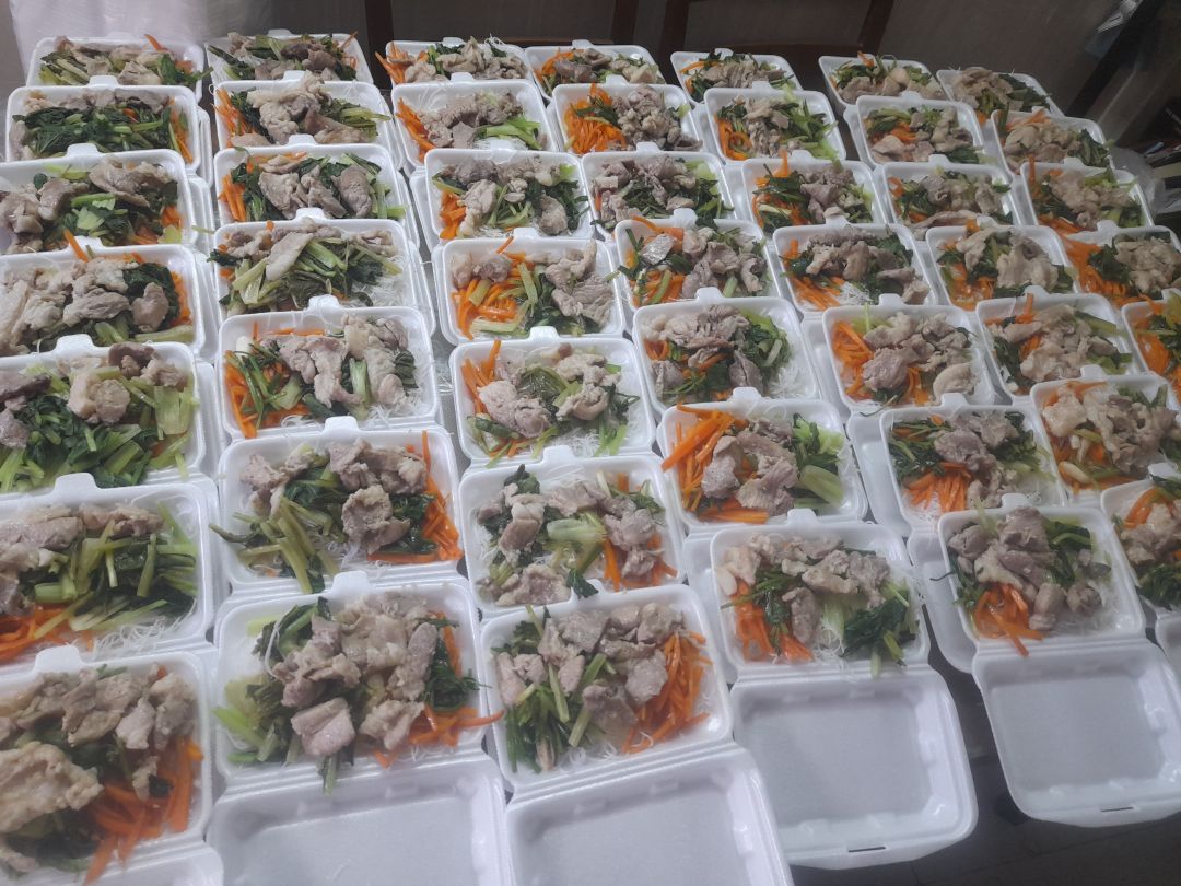 Chiều nấu 150 phần cơm sườn+ thịt rim, trứng chiên, canh bí đao+ thịt băm, sữa Fami
