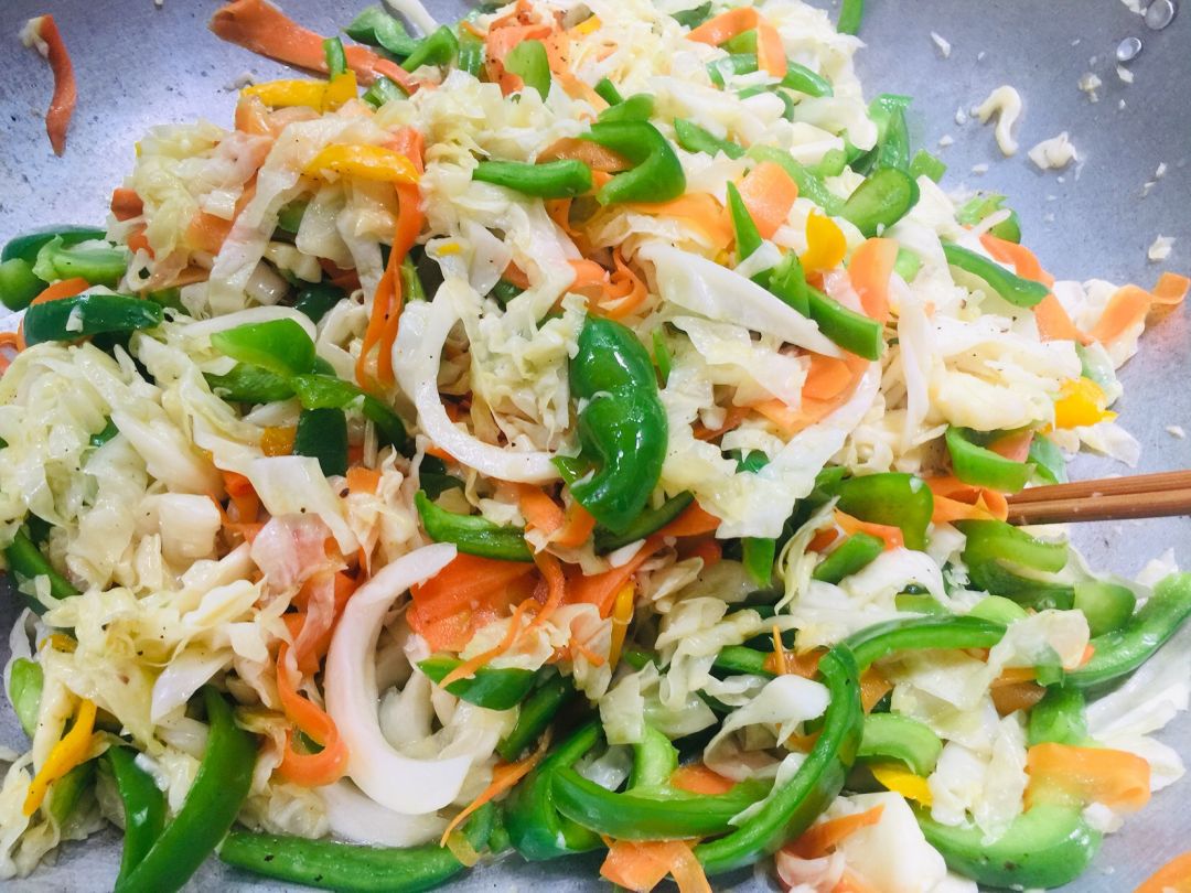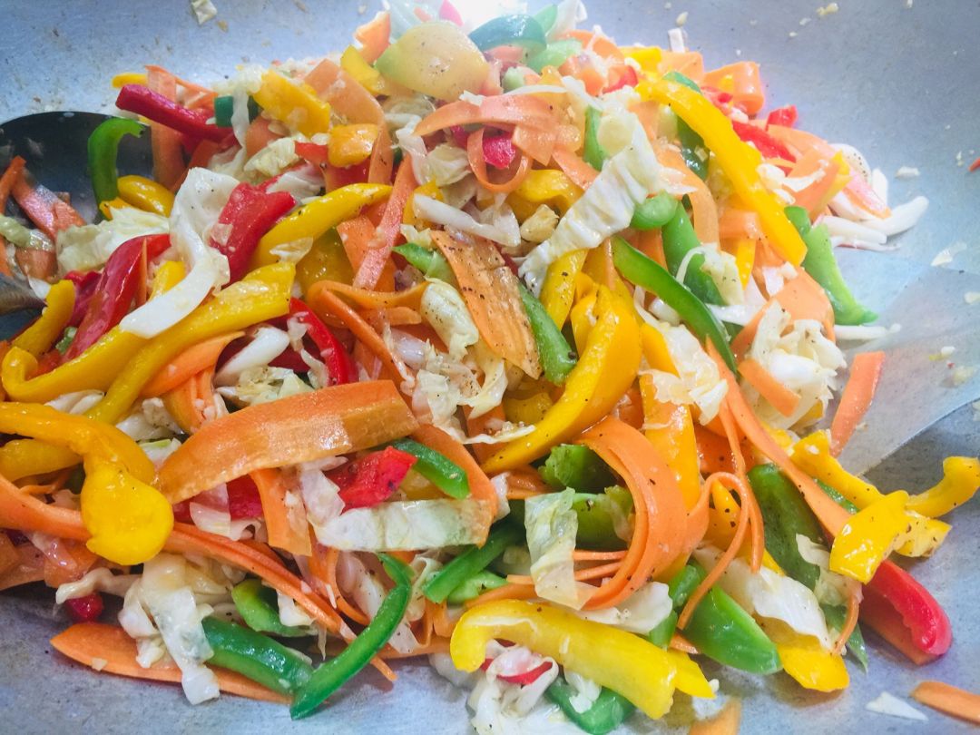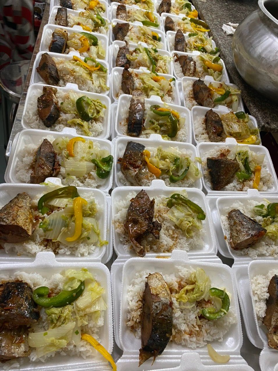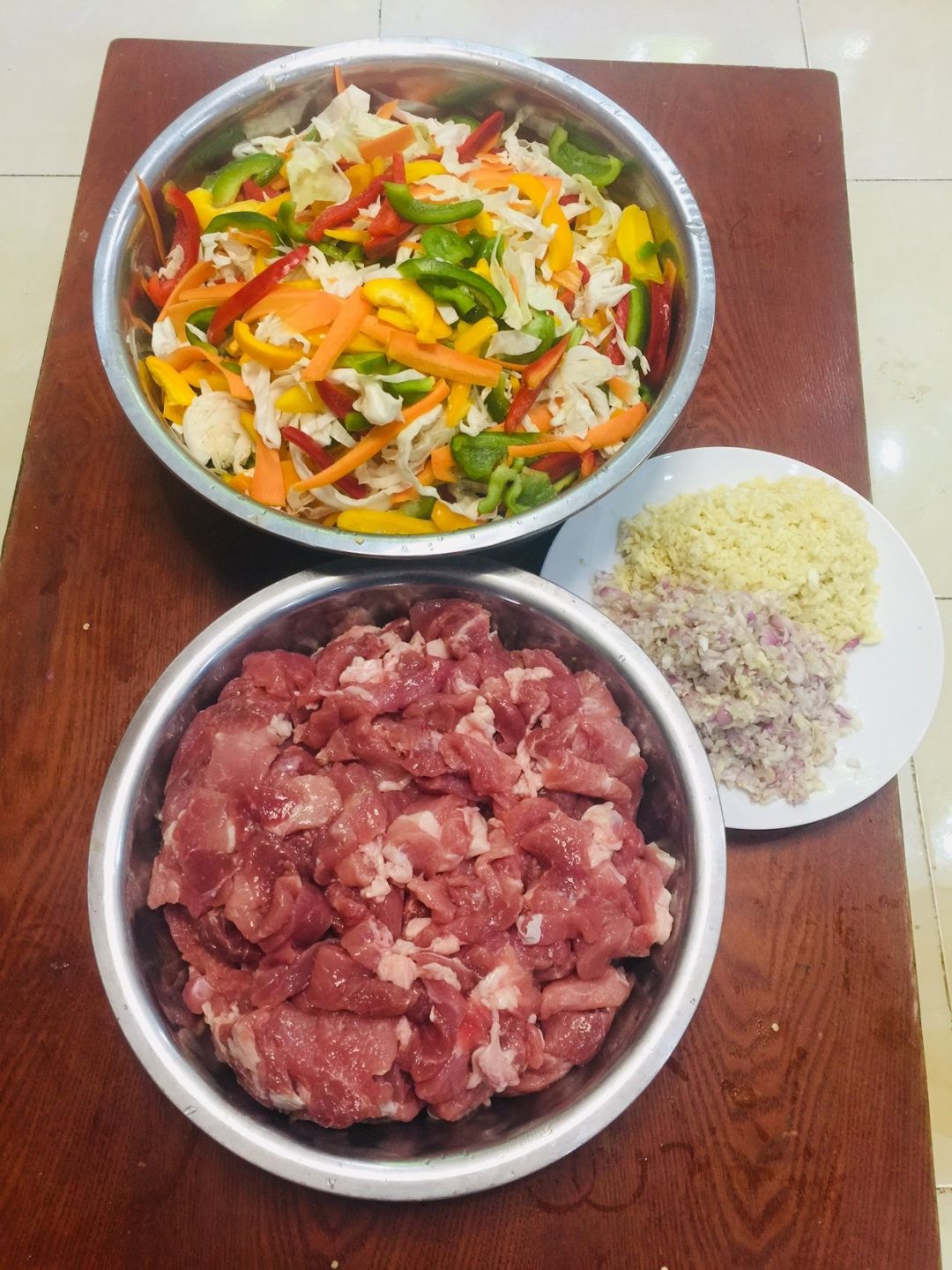 Sáng nấu 170 phần cơm cá chiên sốt cà chua+ ớt chuông, bắp cải + cà rốt+ hành tây+ ớt chuông xào.